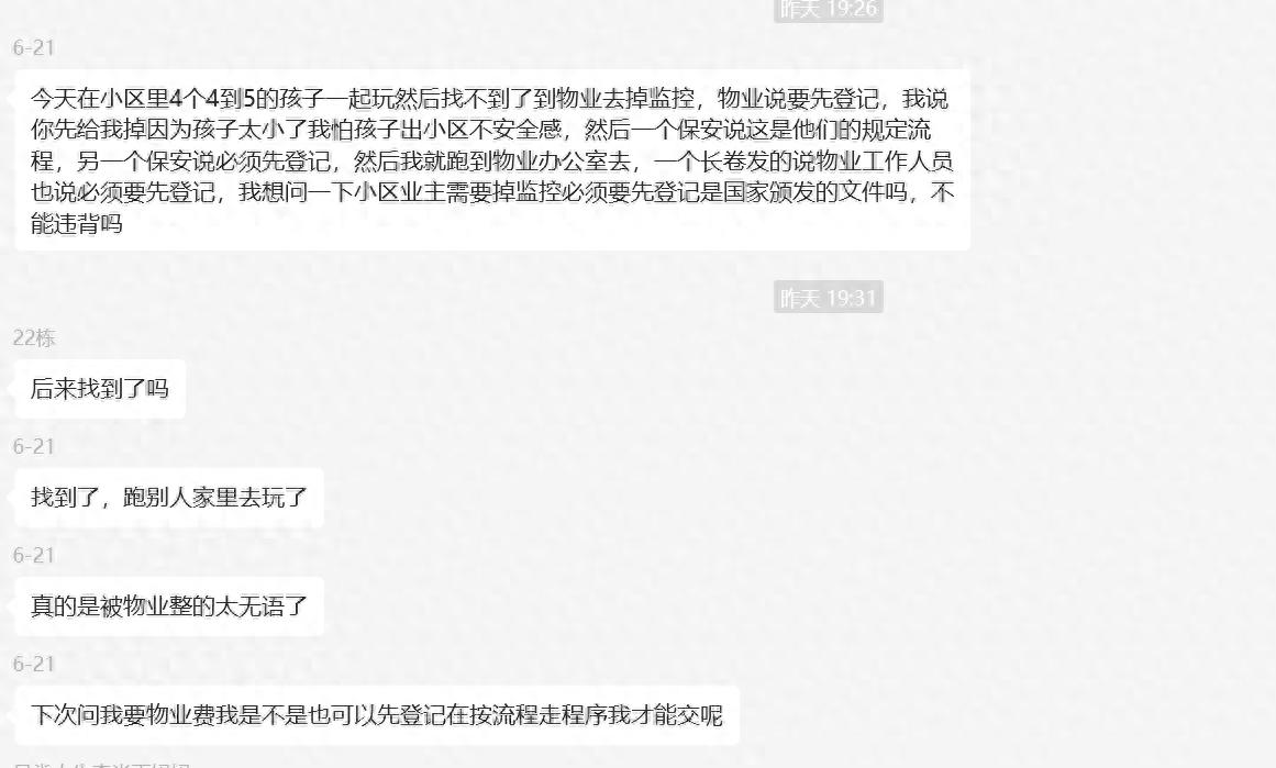 后来看到有业主在群里说,什么不会调监控,都是物业领导安排好的,这孩子找不到了又不是别的事情,还要等他们流程走完才能看,他们领导不在就永远看不了监控,这不是明显在耽误事吗。