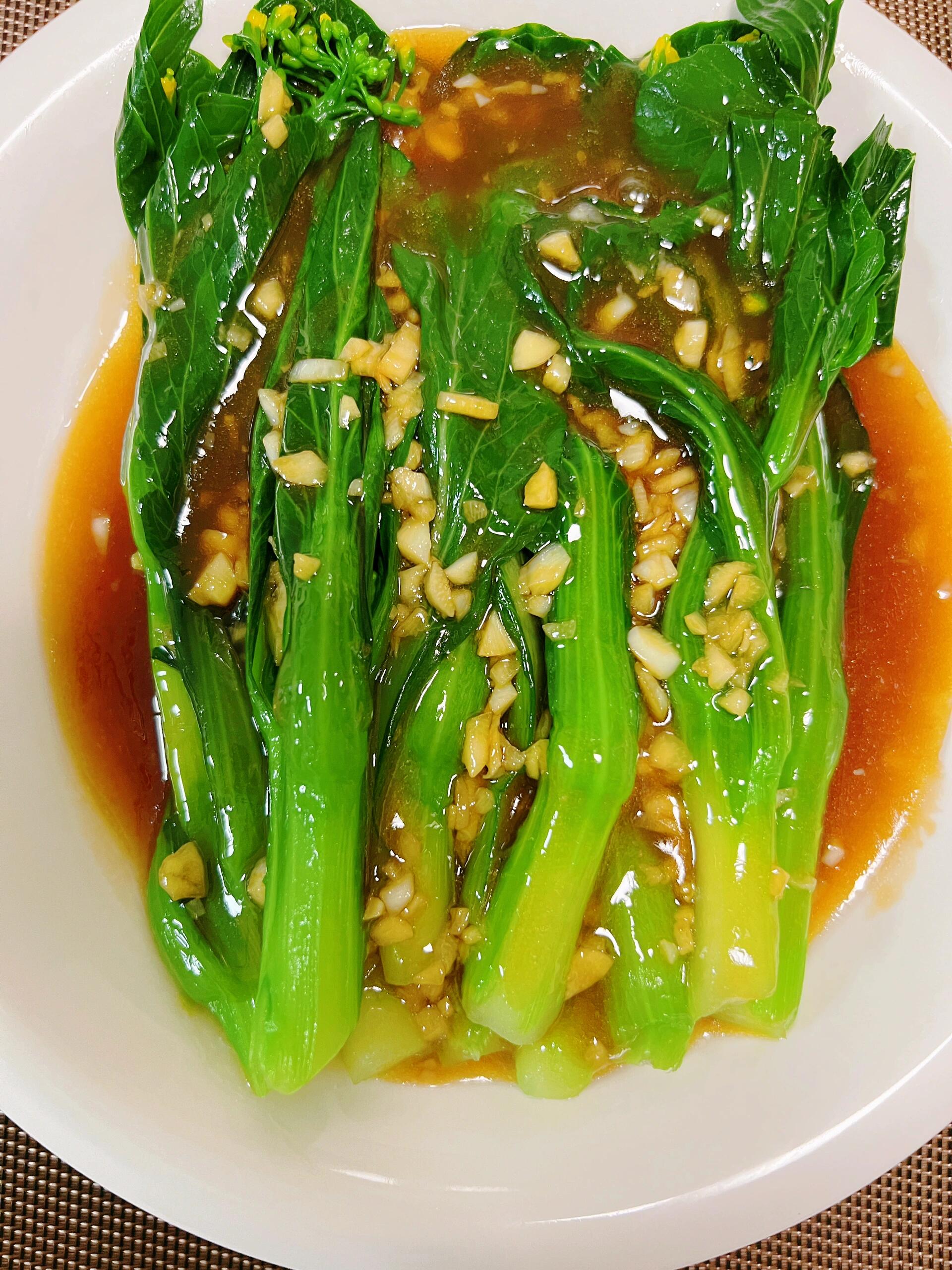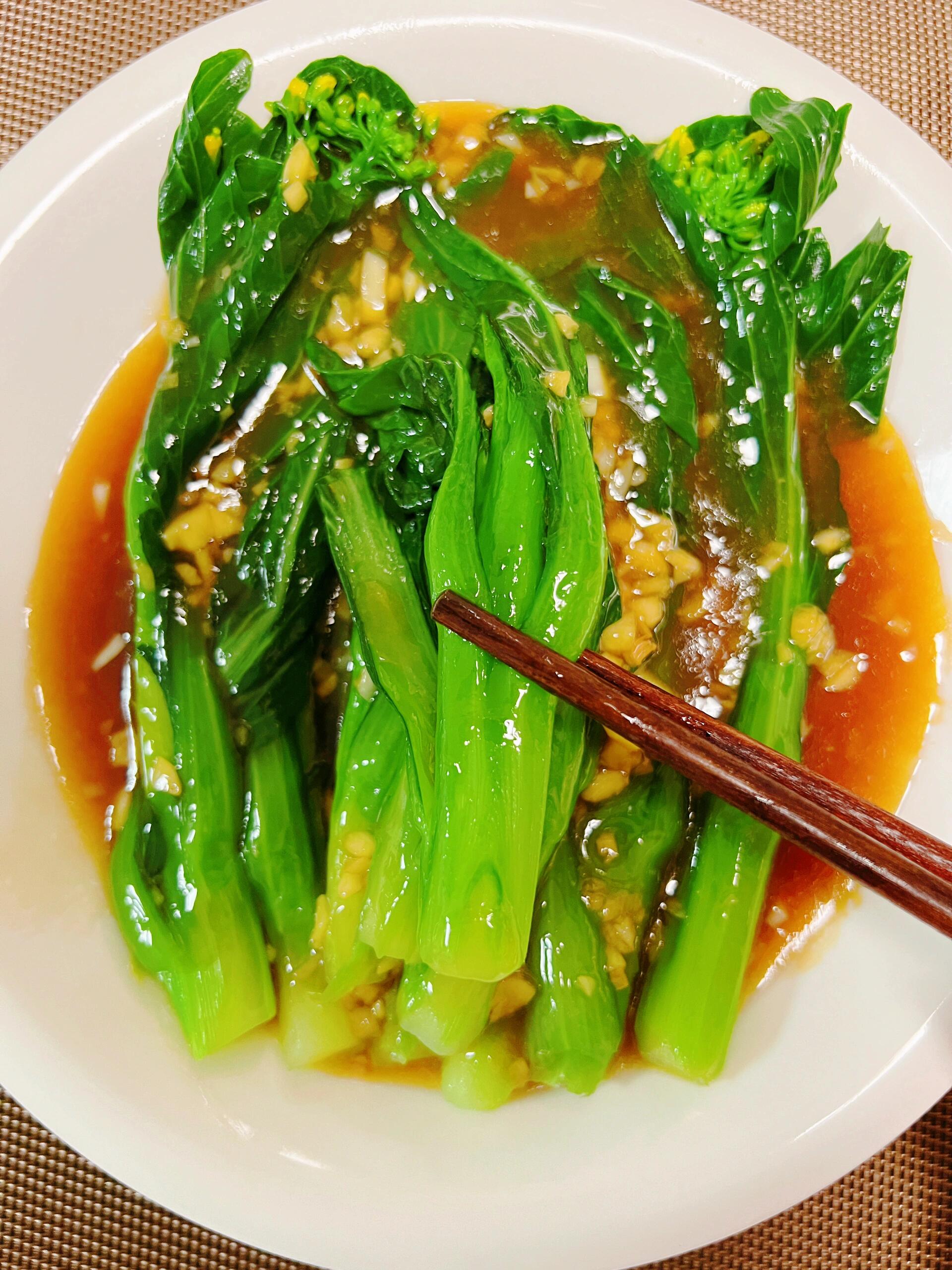 这道菜的材料简直不能再简单了:菜心一把(大概400克左右)、大蒜一头、盐、生抽、蚝油,没了!就这几样东西,却能碰撞出让人惊艳的味道。