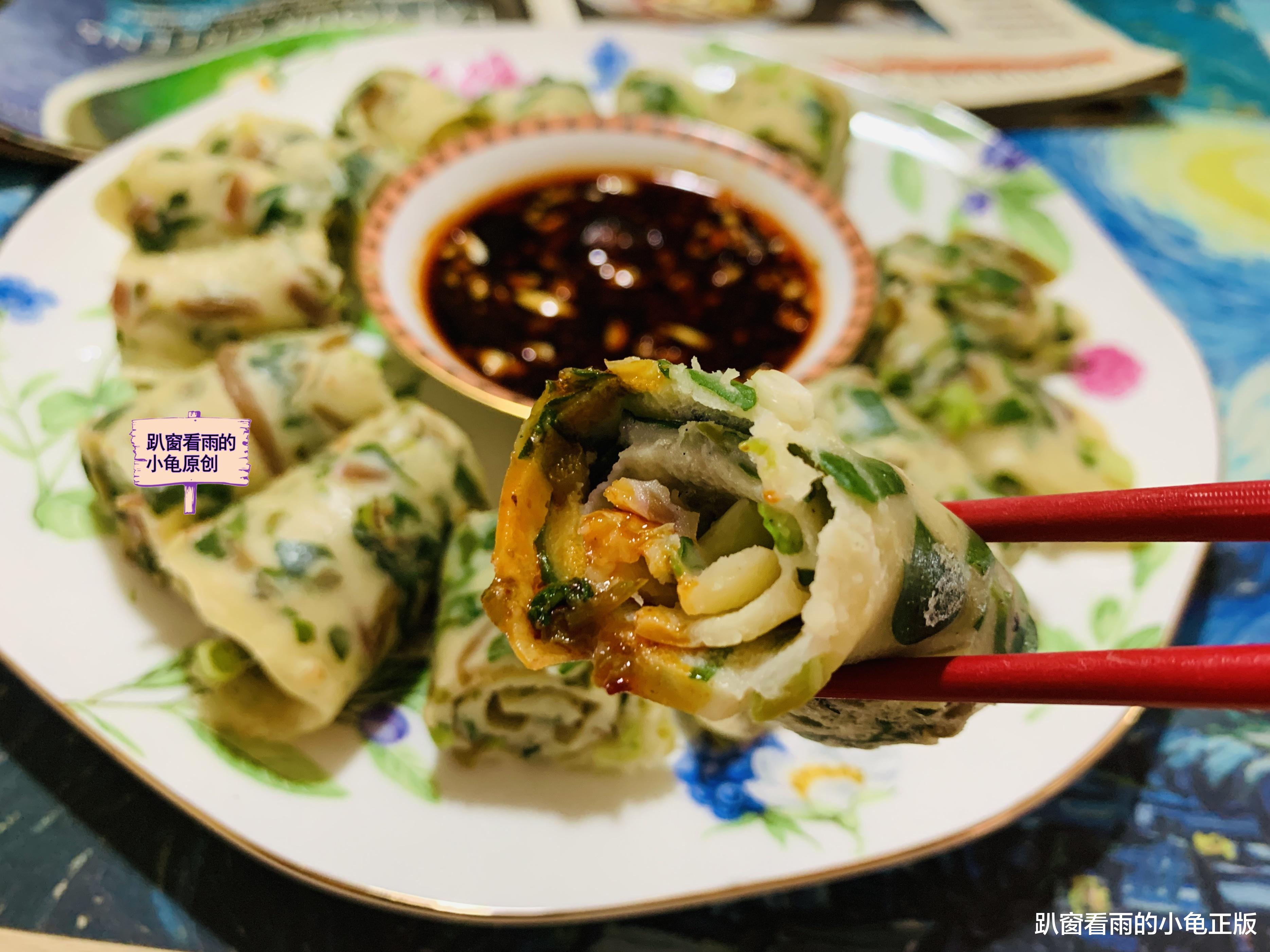 4、 火上坐锅,锅热倒油,油热后转小火,舀一大勺碗中的面糊,转动锅把,让面糊平铺在锅底薄薄一层、且呈圆形。待面饼边缘翘起时,翻面,再烙另一面。煎烙熟后,盛出。再将煎好的小饼逐个卷起,用刀从中间切断,摆入盘中。吃的时候,将小饼蘸着料汁吃,鲜香味美,趁热吃最佳~