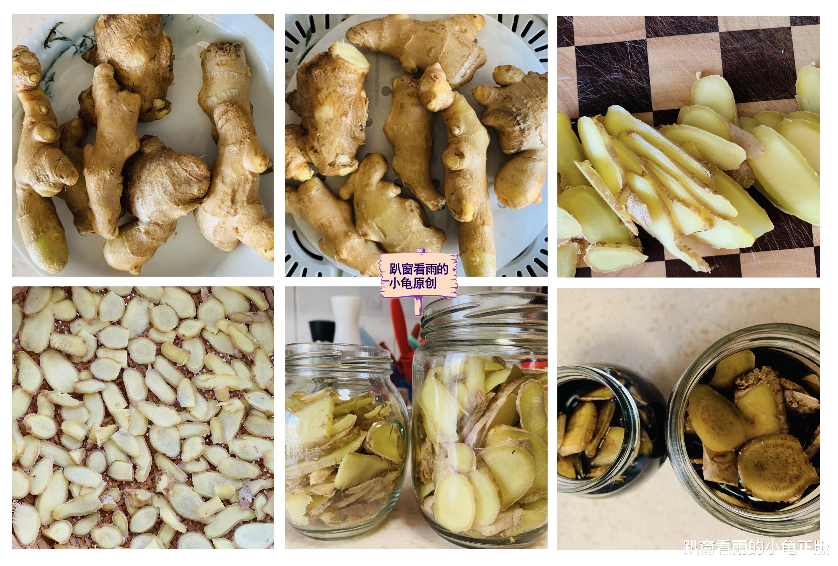2、 将姜取出待凉后切成片,然后平铺并晾至有些微微发干。