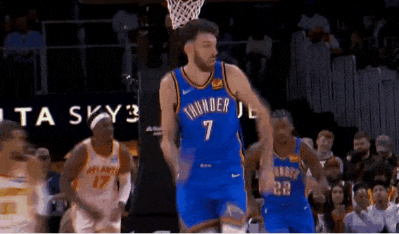 今日NBA常规赛,雷霆对阵老鹰的比赛正在进行中。比赛第二节,古耶迎着霍姆格伦扑防,从天而降完成战斧劈扣。