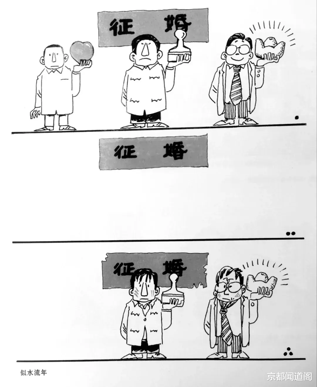 第一幕,“男嘉宾”自我介绍。尽管他们保持一定的“克制”,台下的“女嘉宾”及其亲友团也能做出准确的判断:男三号有钱,男二号有权,男一号带着一片真心。第二幕开始的时候,三个人已成亲了。第三幕亮相了,看点在于还有两张面孔,有权的依然有权,有钱的仍旧不差钱。“演出”似乎静止了,而关于爱情、爱情婚姻和人生课题的思考却激活了。把联想和评议交给读者,是作者对读者的信任和尊重,也显现出漫画家对题材把握的扎实功底。