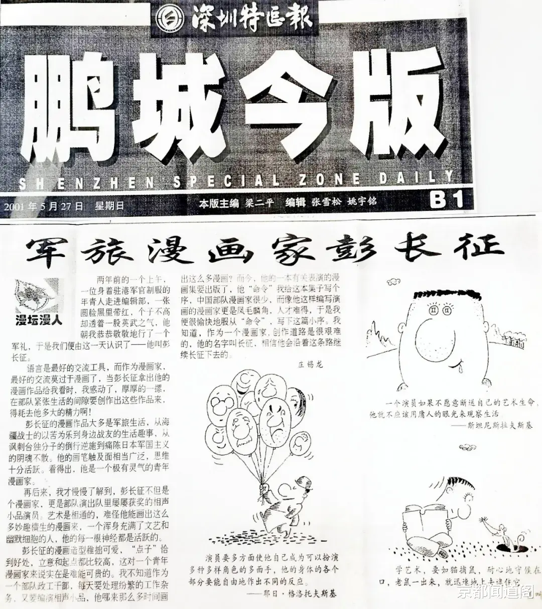 2001年,我在驻香港部队工作期间,结合自己从事的宣传文化工作,用漫画和短文的形式,将在《解放军报》《人民海军报》《海军文艺》《军营文化天地》《战士报》《曲艺》《喜剧世界》等发表的200多幅作品,结集为《演艺麦克风》这本书,由海天出版社(现深圳出版社)出版时,他为之作序,并在《深圳特区报》“筋杜鹃”的漫画专版上以《军旅漫画家彭长征》为题发表署名文章: