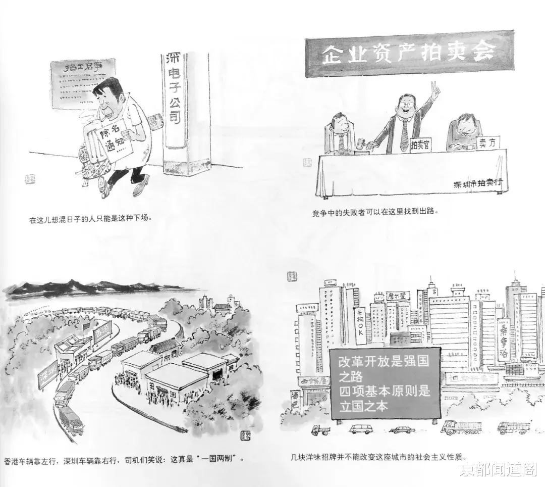 东方风来,人勤春早,深圳汇聚着来自五湖四海的人,他们奋斗打拼在这个新的家园,最终收获芬芳硕果。从一个手拿锄把的客家妹到一个接受记者采访的总经理,这个现象也是当时的社会写照。庄锡龙用漫画记录下这催人奋进的瞬“弄潮儿”。《竞争中的失败者可以在这里找到出路》还原了开全国风气之先,企业资产拍卖会的现场。