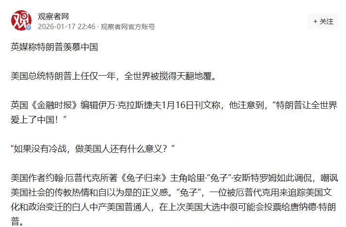 最近,英国《金融时报》刊登了一篇让美国建制派脸红的文章,作者直接抛出了一个重磅观点:特朗普这一年折腾下来,最大的功劳竟然是“让全世界爱上了中国”。
