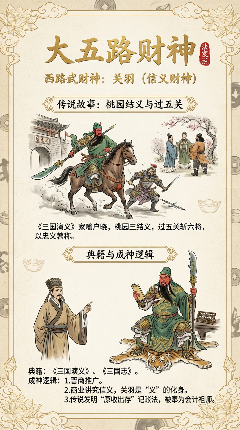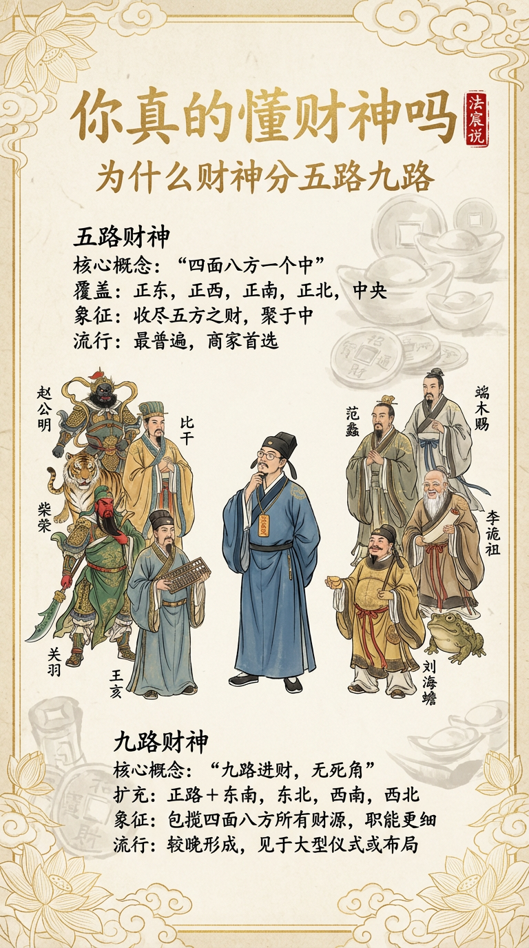 首先,财神不是一个神,而是一个“团体”。 最基础的配置叫**“五路财神”,就是东南西北中,意头是“四面八方来财”。不管是道教正宗的赵公明带四个部下,还是民间流行的历史大咖团(赵公明、关羽、比干、柴荣、王亥),都是为了把正方位的财运一网打尽。 而“九路财神”就是这个团体的“Pro Max版”,在五路的基础上增加了东南、东北、西南、西北四个偏方,主打一个“360度无死角”,特别适合那种跨行跨界、想要全方位搞钱的大企业。