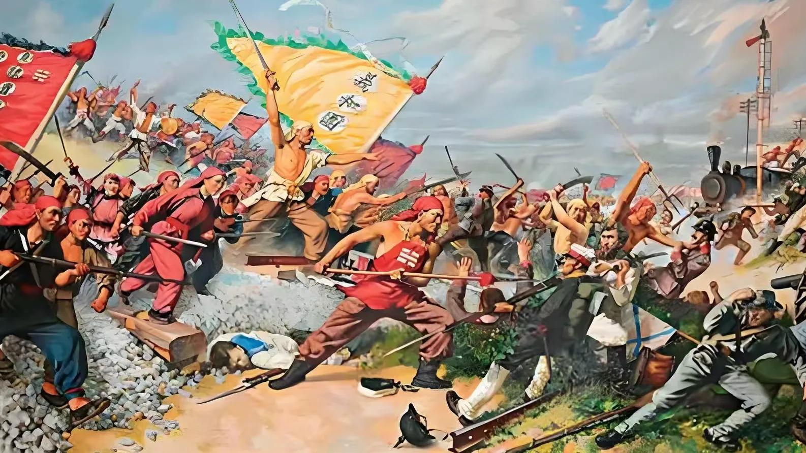 廊坊车站的战斗中,义和团的农民们手持大刀长矛,面对马克沁重机枪的扫射毫不退缩。