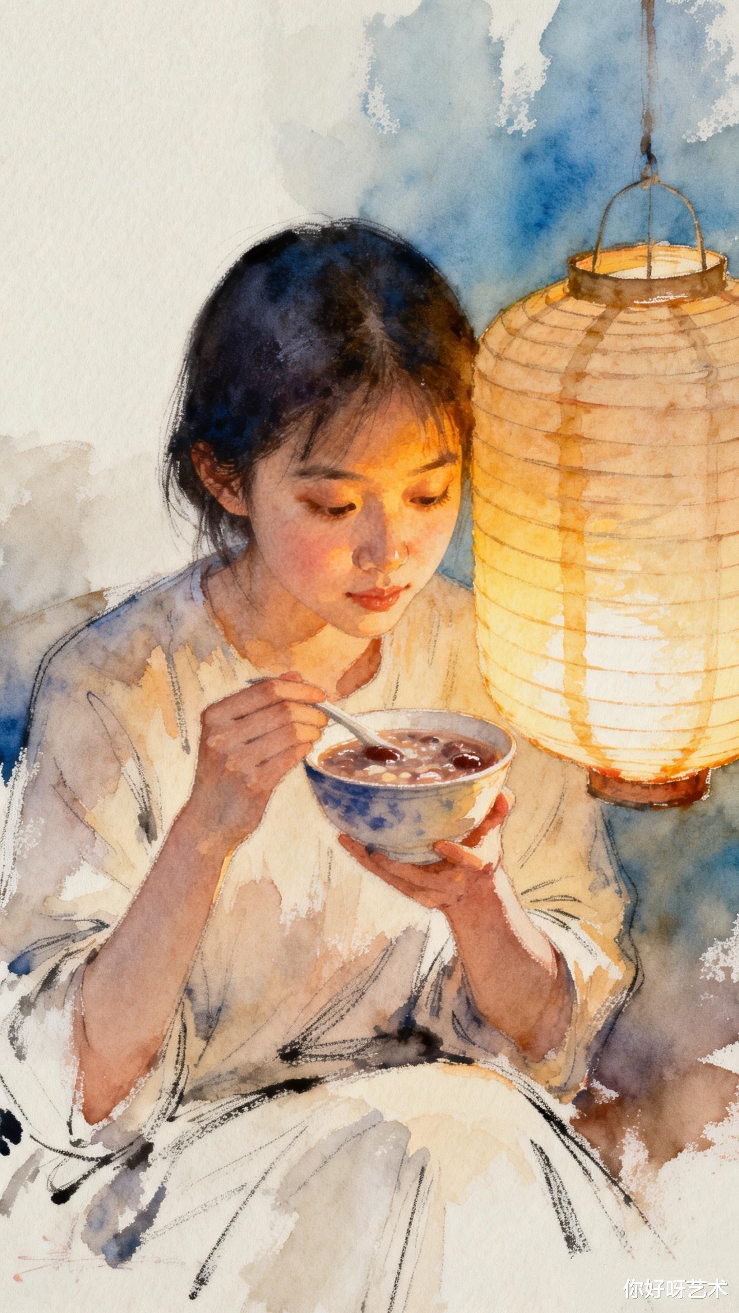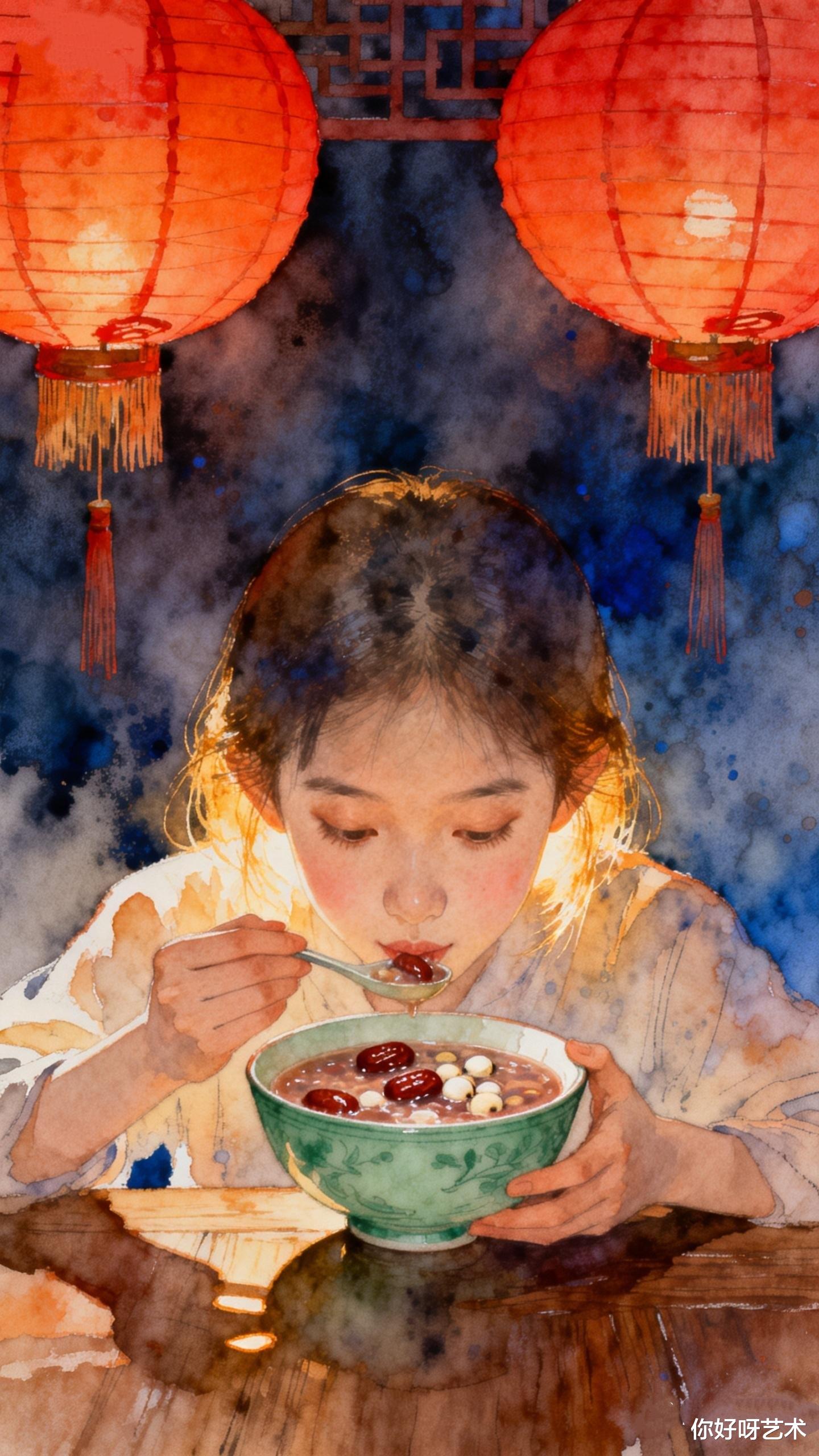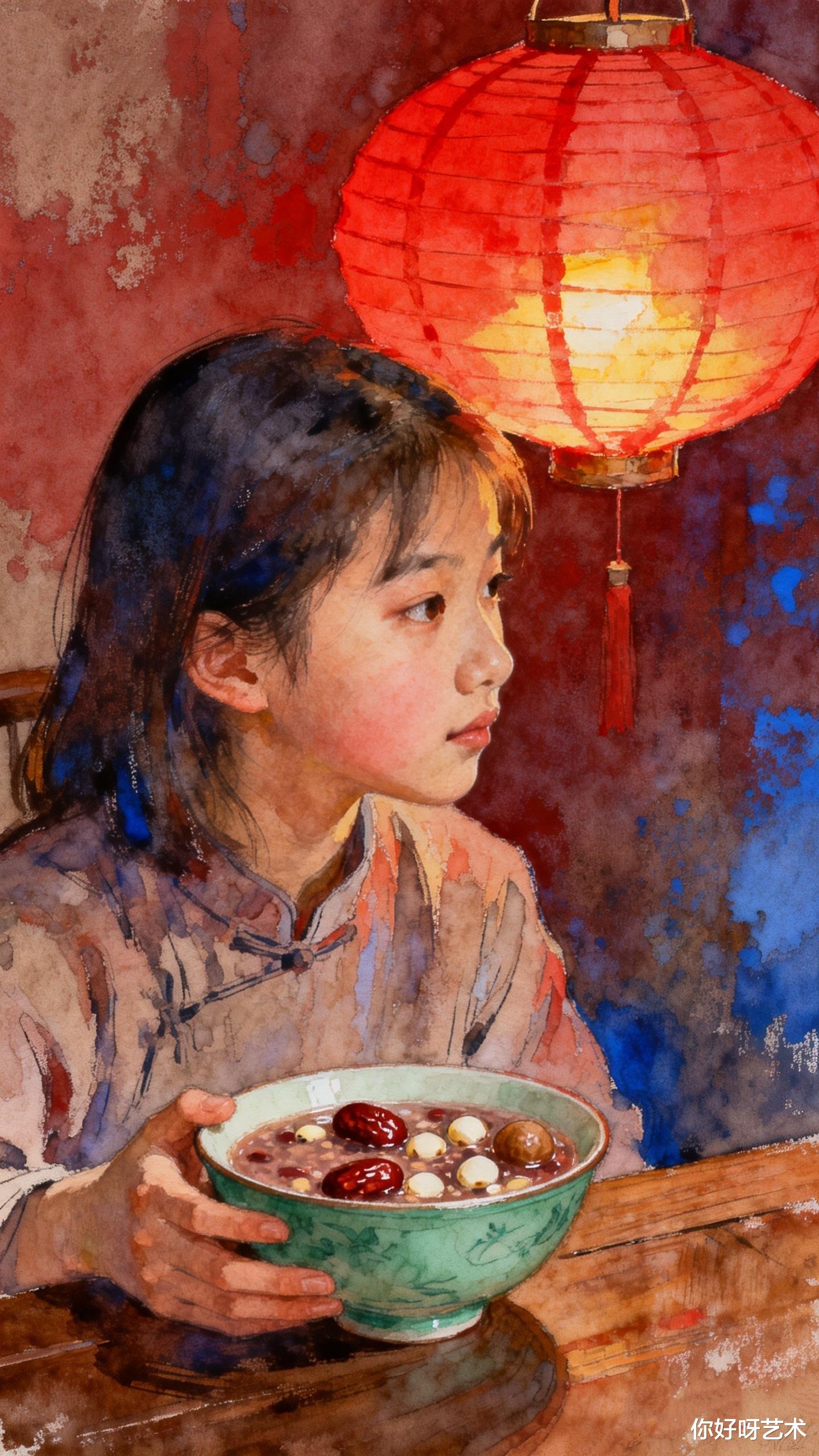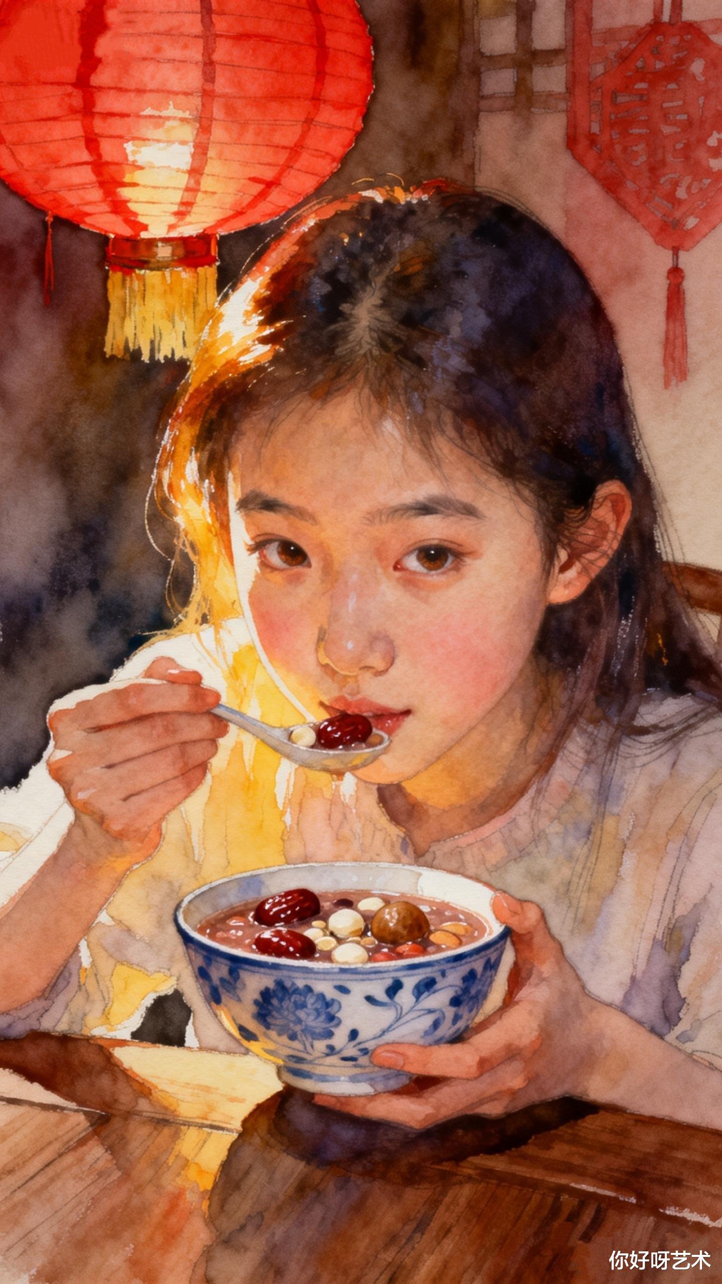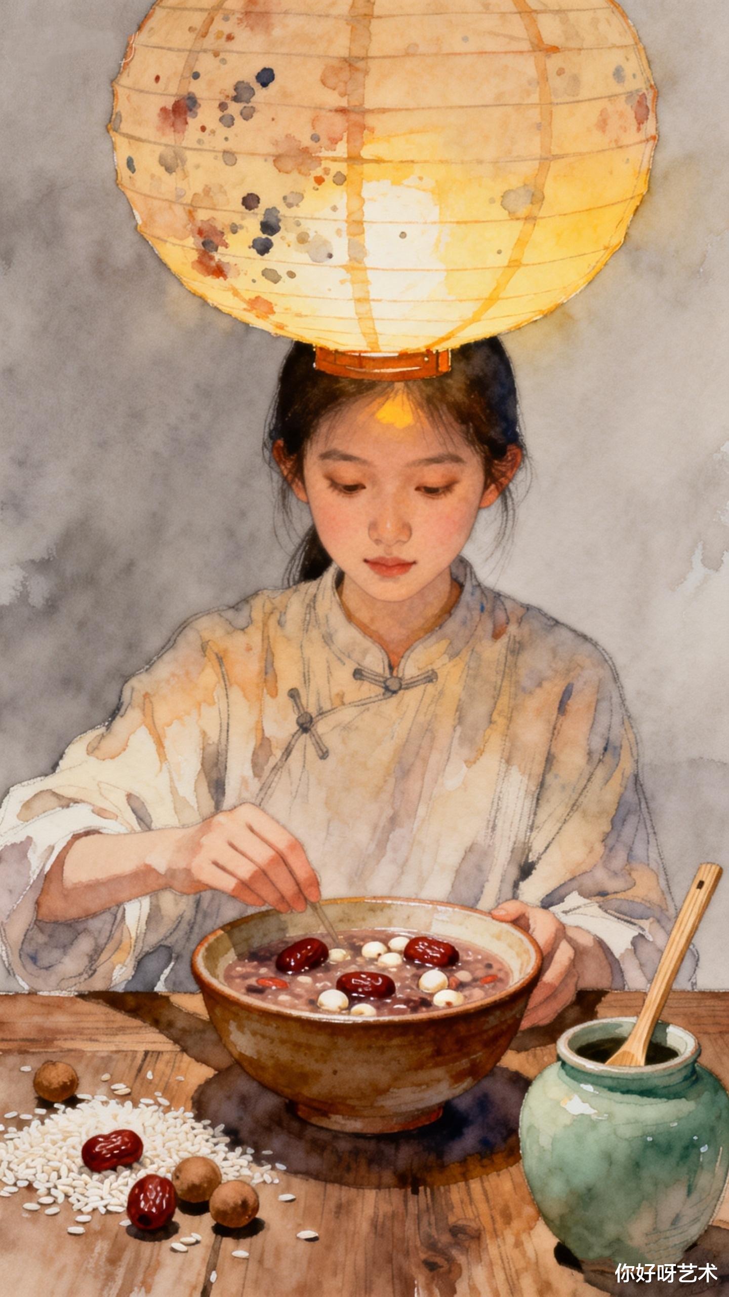 腊月初八的夜晚,水彩与腊八粥完成了奇妙的对话。少女知道,明天太阳升起时,颜料会干涸,粥会吃完,但那些被艺术点亮的瞬间,会像米粒里的淀粉,悄悄转化为生命的能量。在这个被手机屏幕切割的时代,她固执地相信:有些美好,必须用最原始的方式——画笔、灶火、还有一颗愿意慢下来的心——才能完整地捕获。