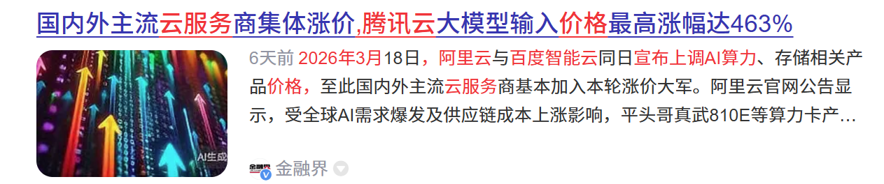 另外,各大云服务大厂纷纷涨价。2026年3月,腾讯云、阿里云、百度智能云相继宣布上调AI算力及相关服务价格。