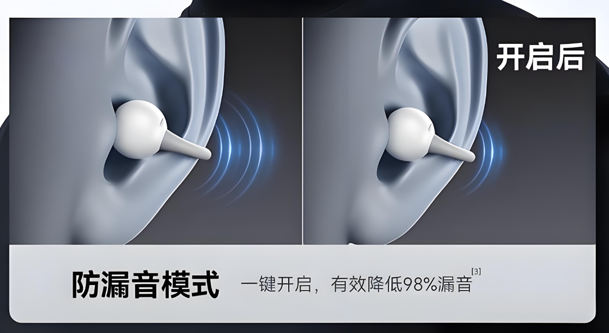 音质和漏音问题也不用愁,它有影院级IMAX全景声场,还是无损音质,加上金标音质认证,高音通透、中音饱满丰富、低音浑厚有劲儿,三频过渡也特别均匀自然。同时内置双层定向传音技术,也就是反向声波技术2.0加上声波聚焦技术2.0,能减少90%的漏音,声波传递也更精准,不会分散,深夜听歌也不打扰别人。