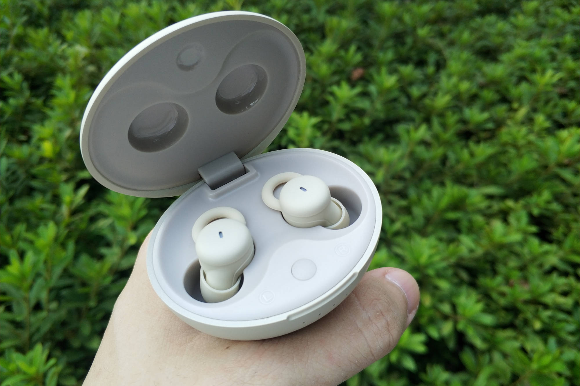 耳机是小巧的入耳式,单只重量较轻,戴上基本没什么负担。它还对佩戴角度做了优化,侧躺时戴也不会很压耳朵,长时间戴着也不太会有硌耳的感觉。