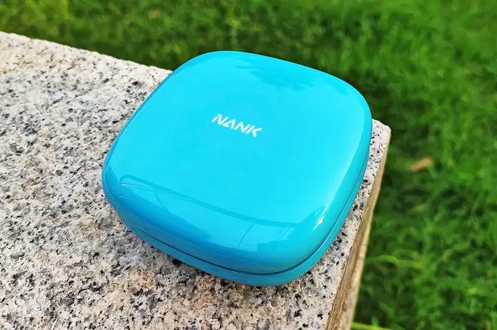 南卡OE CC2以圆润的天蓝色充电仓进行呈现,表面采用高光泽的塑料材质,远处看犹如一款精致的化妆盒。正面有南卡LOGO,触感方面光滑细腻,尺寸方面也便于携带。