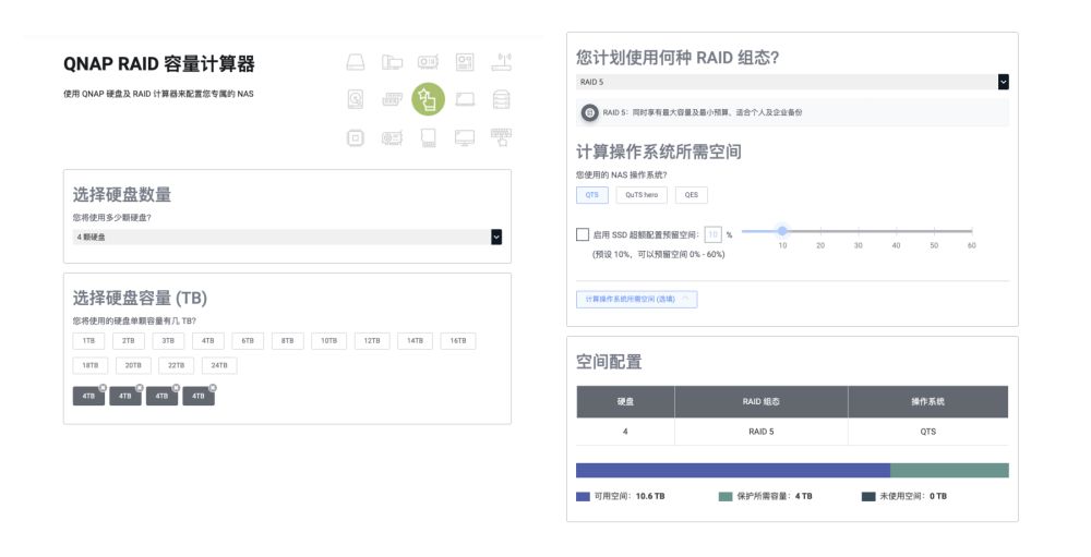 建议在安装硬盘之前先规划一下硬盘的使用情况,评估一下自己需要多少存储空间再去购入相应的硬盘产品,推荐使用官网工具预先计算一下。比如自己如果使用4块4T的硬盘,在RAID5的组态下,自己实际可以使用10.6TB的空间来存储数据,另外4TB用来做RAID冗余。