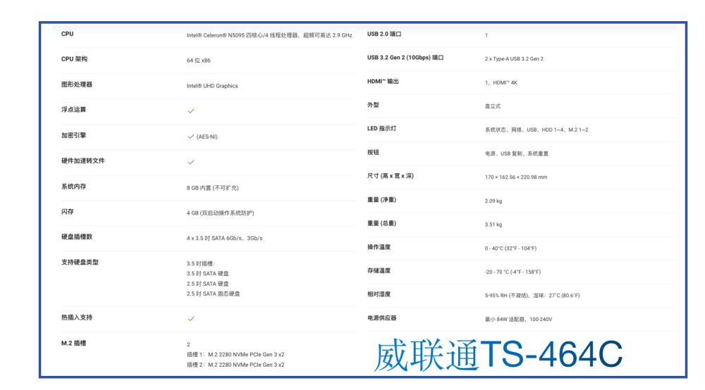 2.产品参数我们先来看一下威联通TS-464C的硬件配置,NAS的能力由硬件配置决定,比如说是不是配置2.5Gb的网口作为影视存储来用。
