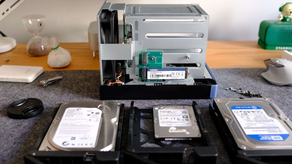 如果自己有M.2硬盘,还可以拆机安装2块M.2硬盘,这样就可以体验高速缓存,让高频使用的数据存储在SSD硬盘,其他低频数据存储在机械硬盘中,提高数据的读取效率。