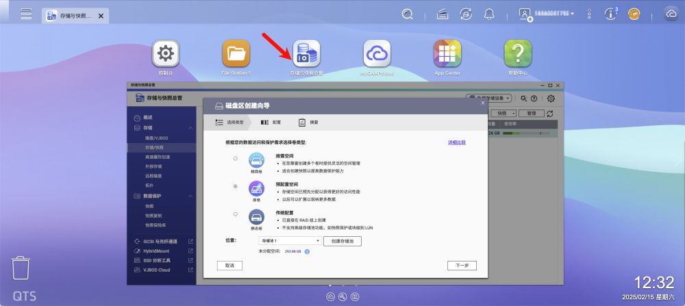 进入QTS页面的第一件事情就是使用“存储与快照总管”创建“存储/快照”,简单理解就是“在Windows电脑中创建D盘E盘”,只有创建好存储后才能将照片、视频等文件存储到威联通TS-464C中,才可以安装各种个样的应用和服务。