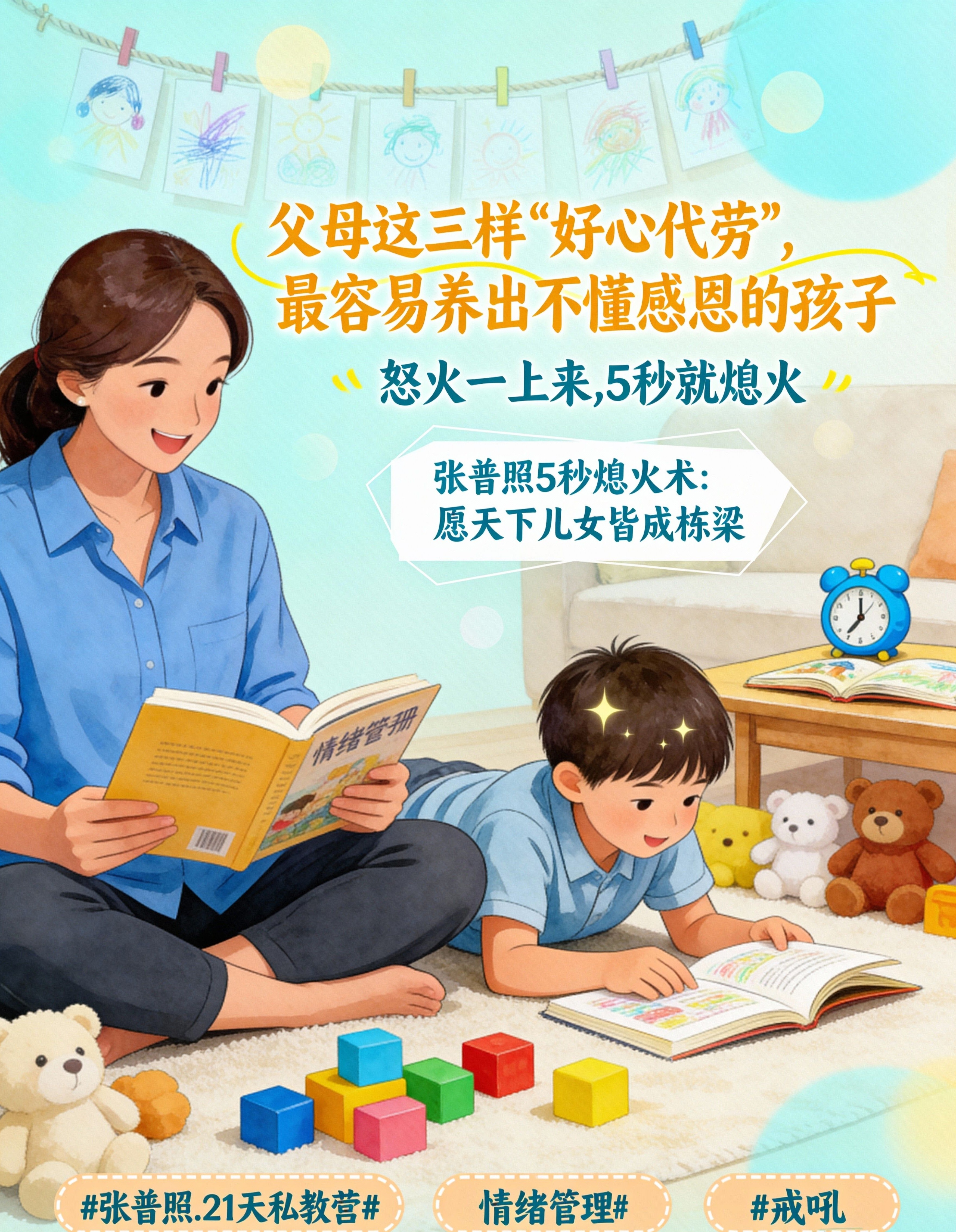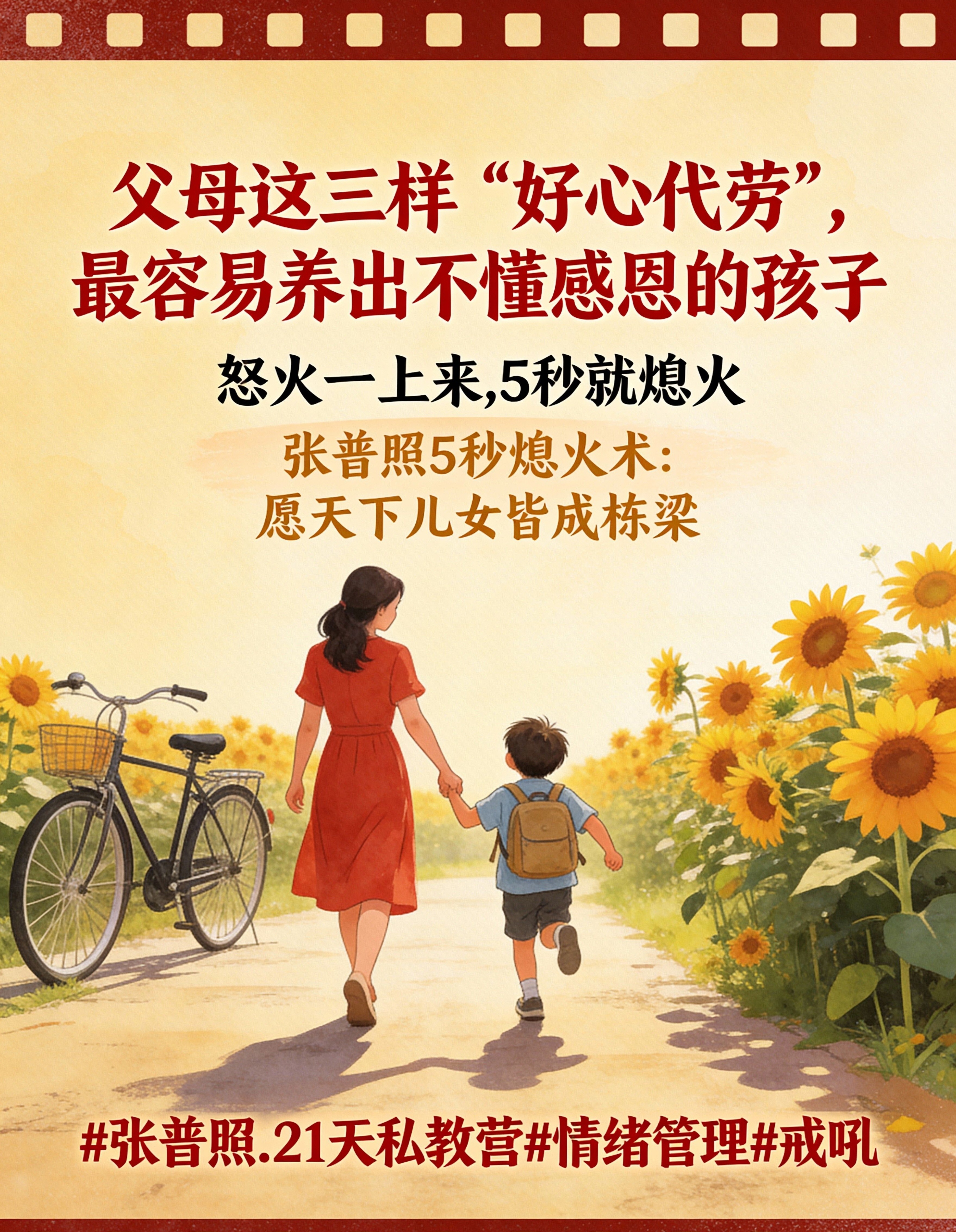 啥“三样好心代劳”啊,说到底就一样:咱当爹妈的,要是每帮孩子做点啥,心里都憋着股“我多不容易”、“你得记着”的委屈气,那你做得再多再好,在孩子那儿也都是“情感高利贷”,他躲都来不及,还感啥恩?张普照5秒熄火术,练的就是咱心里这股“气”。你能在干完活、心里开始冒委屈的那5秒,从里头把这股气“化”没了,让自己干得清清白白、心甘情愿。你给得痛快,他接得才踏实,心里那点暖和和、想对你好的心意,才能自个儿长出来!把那“5秒”练成习惯,比你为他当牛做马一辈子都强,这才是养出知冷知热好孩子的真经!