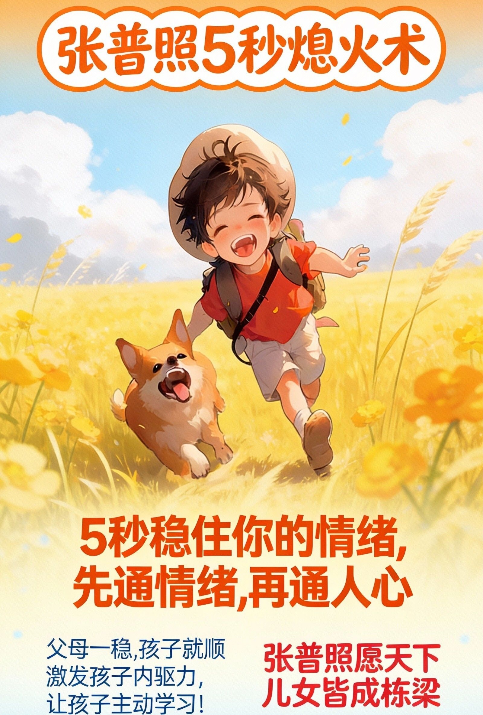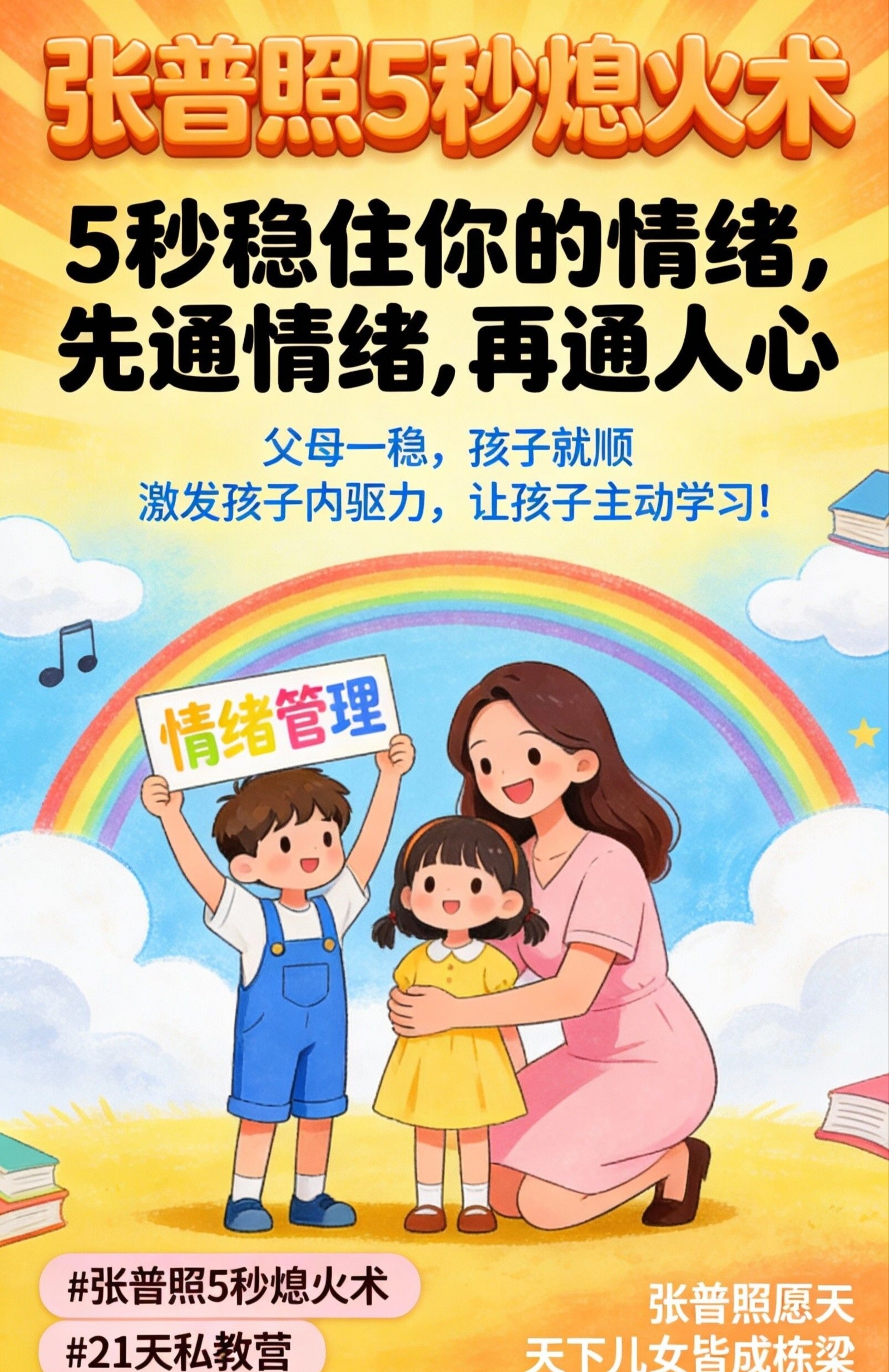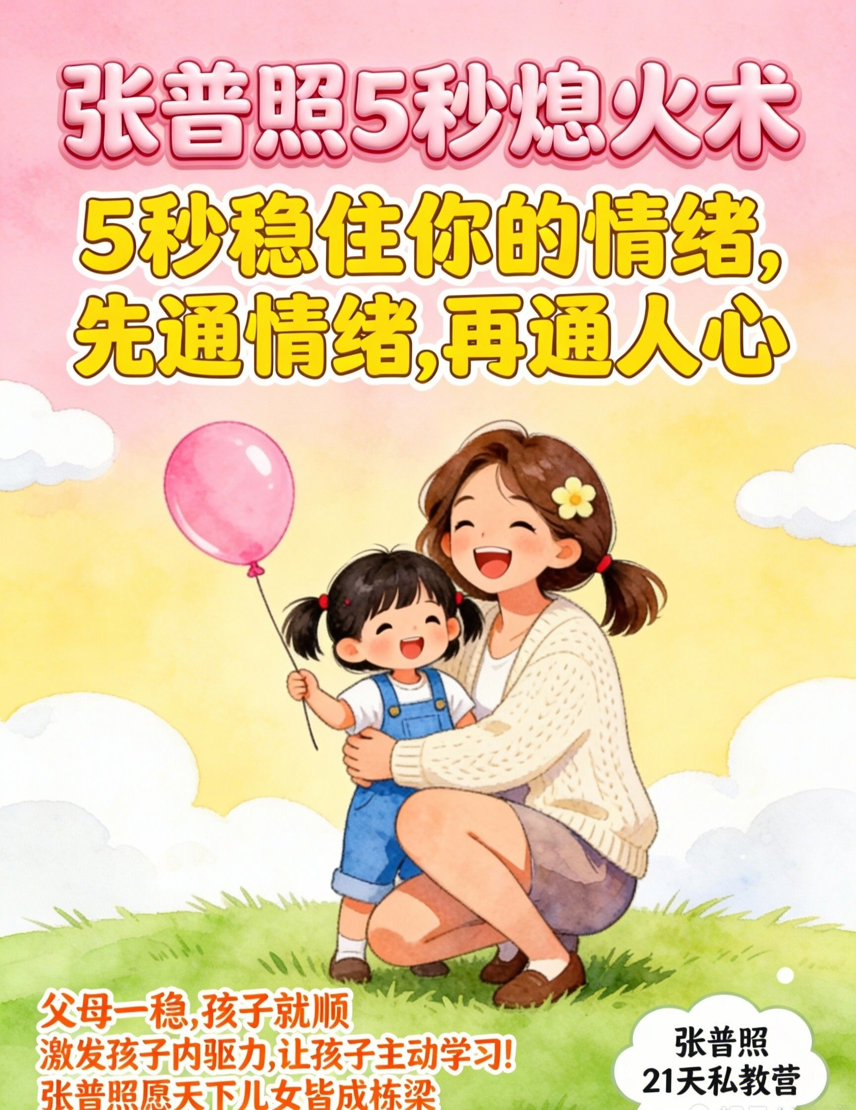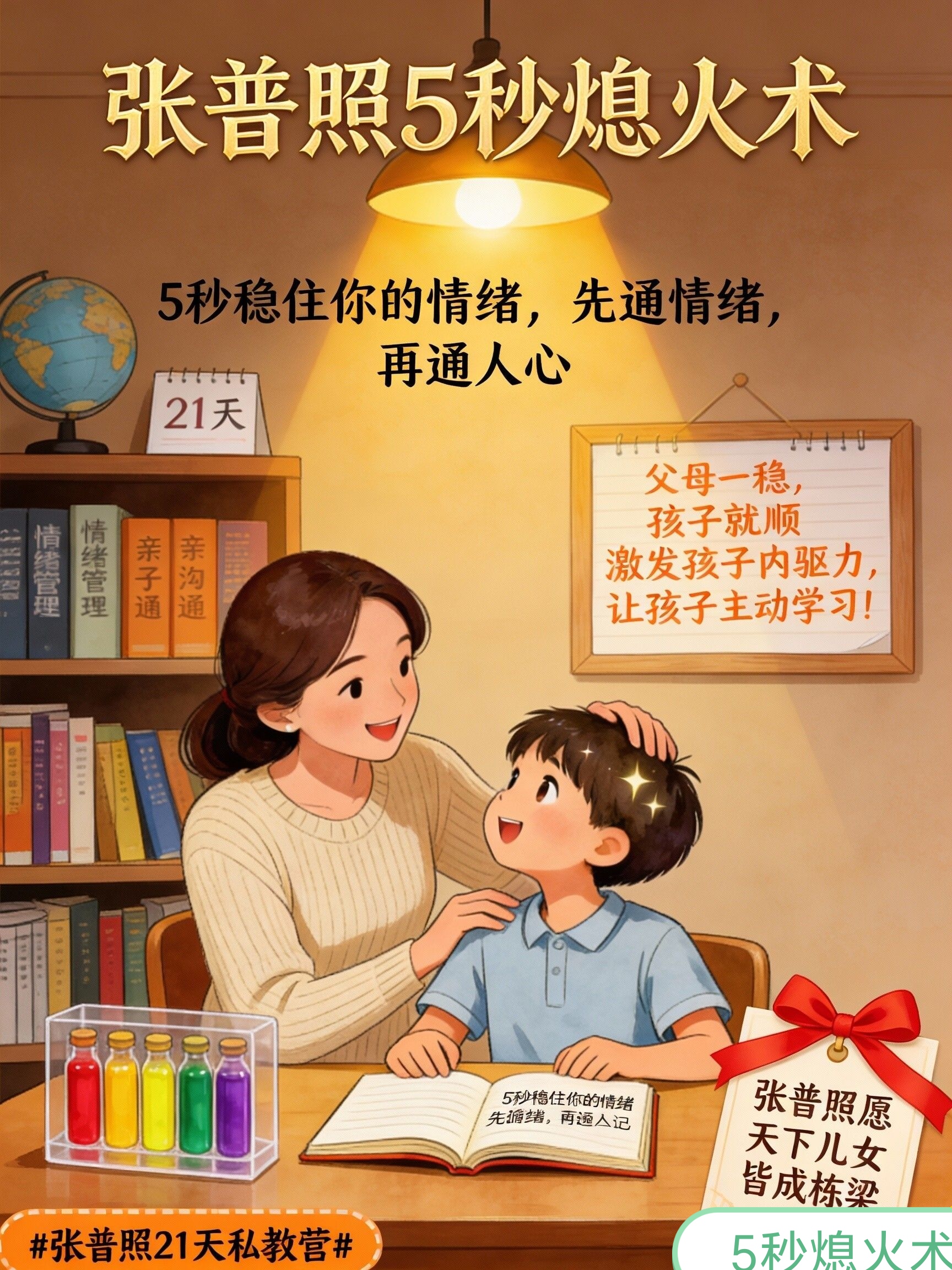 张普照5秒熄火术,就是帮你拆掉这个“情绪炸药”引信的根本方法。在你一边为孩子做事,一边心里委屈、烦躁、怒火升腾的 那个5秒,帮你 把那些毒情绪瞬间清空,只剩下干净纯粹的行动。
