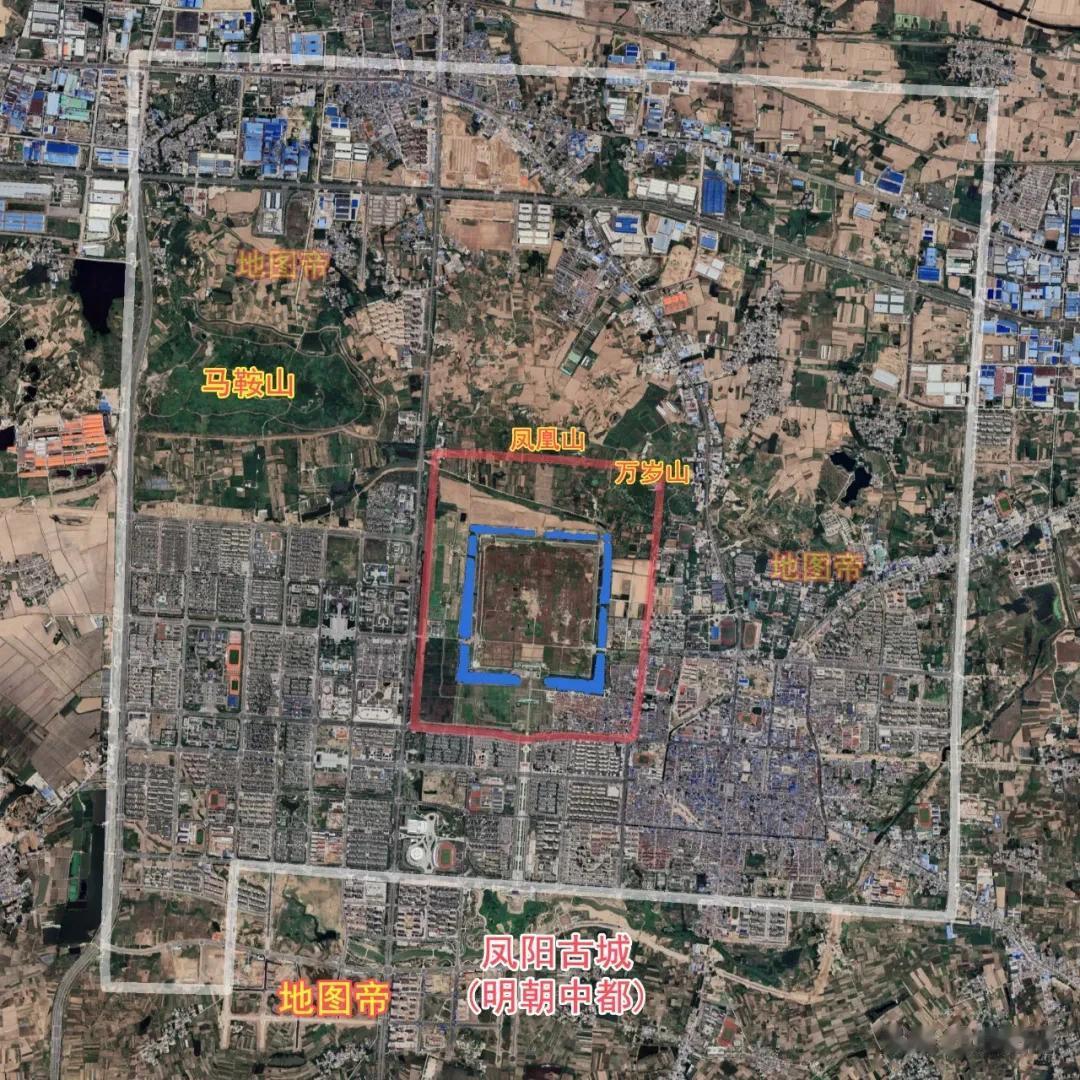 明中都由外城(相当于明清北京城)、中城(禁垣,相当于北京皇城)、皇城(相当于北京宫城)三部分组成,城南为圜丘(天坛)和皇陵,城北为方丘(地坛)。
