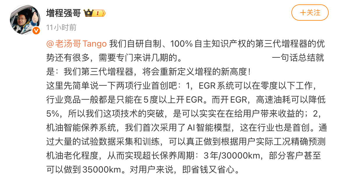 2026年2月26日晚,理想汽车增程系统负责人“增程强哥”在社交媒体平台发文称,理想L9 Livis搭载全新自研自制的第三代1.5T四缸增程器,可以做到“既省钱又省心”。