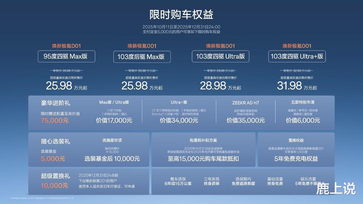 10月11日,豪华猎装轿跑焕新极氪001正式上市,官方零售价26.98万元起,超级置换权益后,限时售价为25.98万元起。即日起,用户可通过极氪App、官网、小程序及全国极氪门店等官方渠道预订。