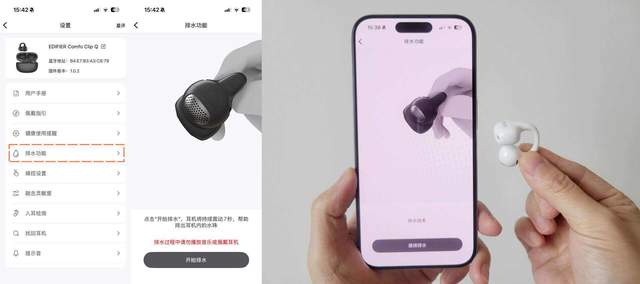 值得一提的是,漫步者Comfo Clip Q具备IP56级防尘防水能力,运动出汗或是下雨天佩戴都没有问题。要是不小心进水了,我们可以在Edifier Connect APP中长按排水功能,耳机便会启动一键震动排水,主动完成清理,省心又可靠。