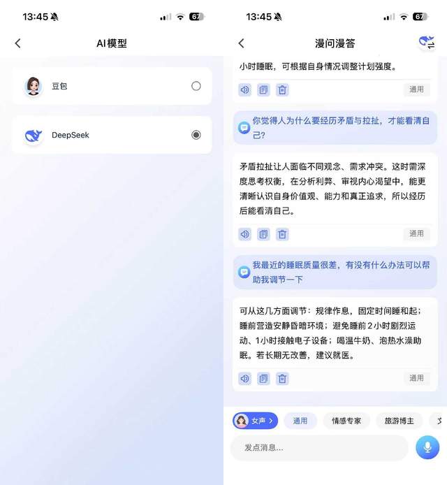 APP还内置了DeepSeek和豆包两大AI模型,相当于为我配备了一位全天候的智能助手。无论是突然冒出的奇思妙想,还是工作中遇到的疑难问题,我都可以随时提问,并能立刻得到清晰、有用的解答,极大地满足了我的好奇心和即时性的信息需求。