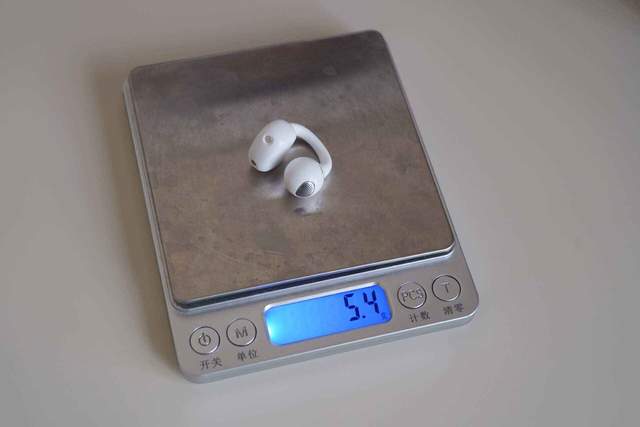 耳机本体非常小巧,拿在手里几乎感受不到重量。实测单只耳机仅5.4g,约一枚硬币的重量。得益于多曲率人体工学软梁设计,耳机具有良好的韧性与回弹性,可迅速恢复原状,从而自适应不同用户的耳廓形状,提供既贴合又稳固的个性化佩戴体验。
