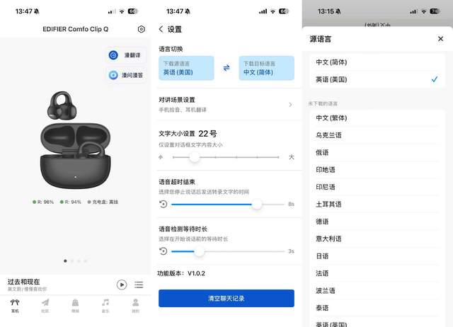 通过“Edifier Connect”App内置的翻译功能,我所说的中文能被实时转换为英语、德语、法语、韩语、日语、意大利语等多种语言,实现了无障碍的跨语言交流。