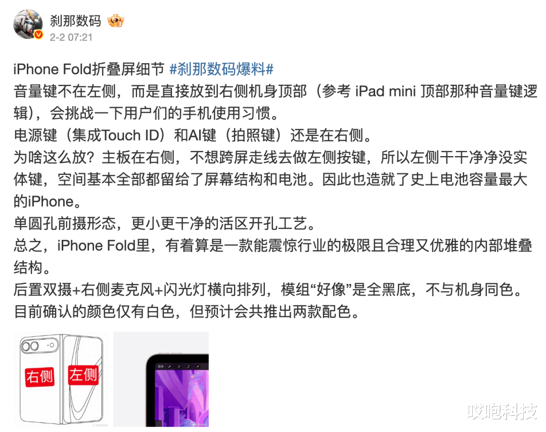 朋友们,音量键被踢到了「右侧机身的顶部」。参考 iPad mini 那个音量键的逻辑,对,就是那种感觉。以后想调个静音或者加减音量,你的手指得学会做点新体操了。至于电源键(集成了 Touch ID)和那个新的 AI 拍照键,也都挤在右侧。这不仅是挑战用户习惯,这简直是在重塑你的握持姿势。