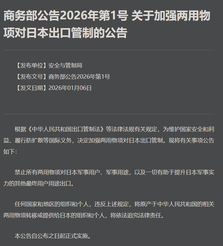 据商务部网站发布的公告,1月6日,商务部将从公告发布之日起,加强对日本两用物出口管制。中国将禁止所有两用物对日本军事用户、军事用途,以及一切有助于提升日本军事实力的最终用户出口。