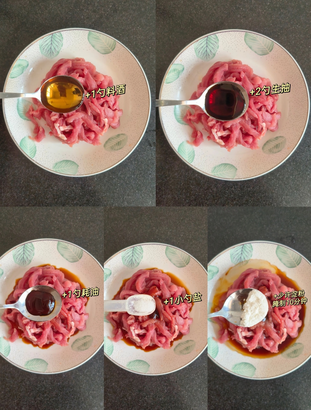 制作这道美食的第一步,是精心处理里脊肉丝。将新鲜的里脊肉切成细丝,放入碗中腌制,这是肉质鲜嫩的关键。加入一勺料酒去腥,两勺生抽提鲜,再放一勺蚝油和一小勺盐增加底味,最后撒入少许淀粉抓匀,静置腌制十分钟。这一步能让肉丝充分入味,并在烹饪时保持滑嫩的口感。