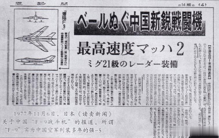 1977年11月6日,日本《读卖新闻》关于中国“F-9战斗机”的报道,所谓“F-9”实为中国空军列装多年的强-5。