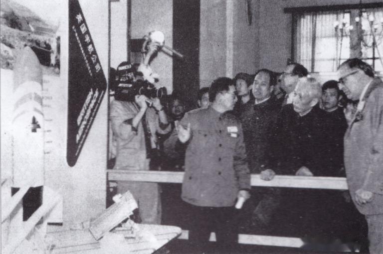 王震听取展场工作人员介绍英国宇航公司的“旋火”远程反坦克导弹