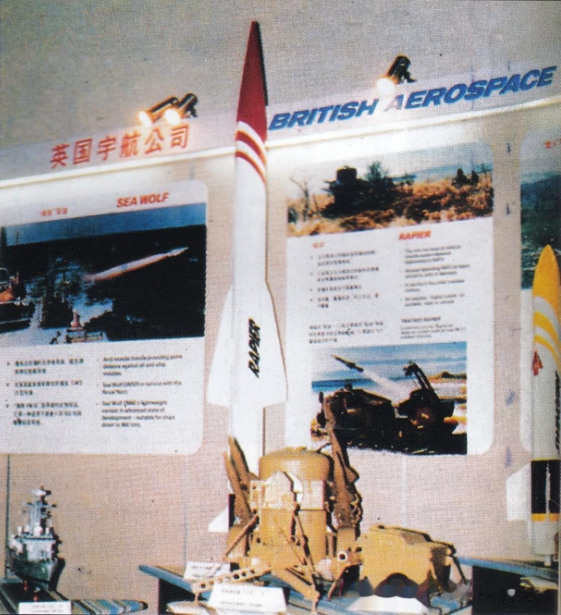 除了展出大家熟识的“鹞”式战机模型外,英国宇航公司还介绍其新式的BAe.146型中程喷气运输机,这种载客量约90人的客机,可代替中国当时使用的苏式安-24飞机。这种飞机适用于快速发展的支线航空事业,连接各大城市间的空中交通,提高空中运输能力,并且满足解放军在特种航空方面的需求。英国字航公司动力部则展出了多种先进战术导弹,包括“天空闪光”式中距空空导弹等。