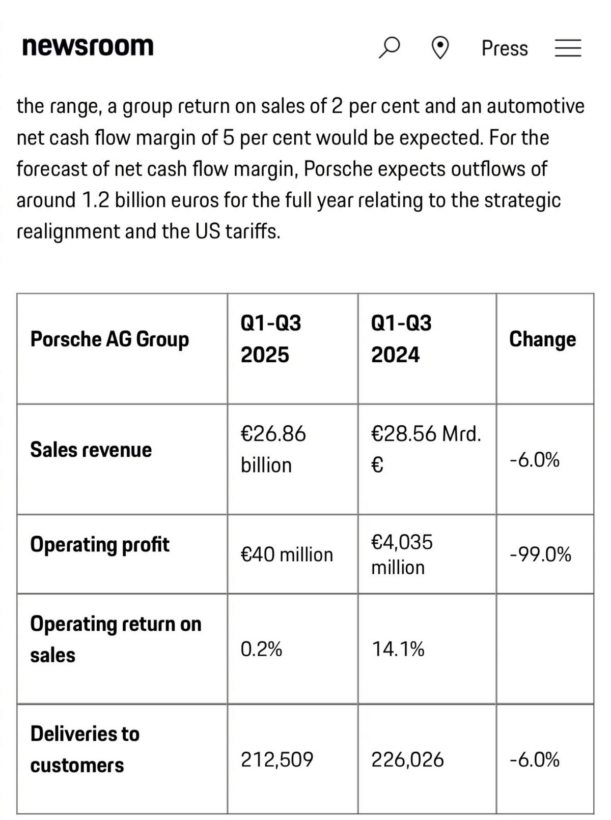 曾经被视为利润奶牛的保时捷,最近有点奶不动了。今年前三季度,保时捷经营利润暴跌了99%,只剩下区区4000万欧元。要知道,它的销售额跌幅不过6%。这就像一个顶级餐厅,客流量没少太多,但突然不赚钱了——问题不出在翻桌率上,而出在菜单和成本。