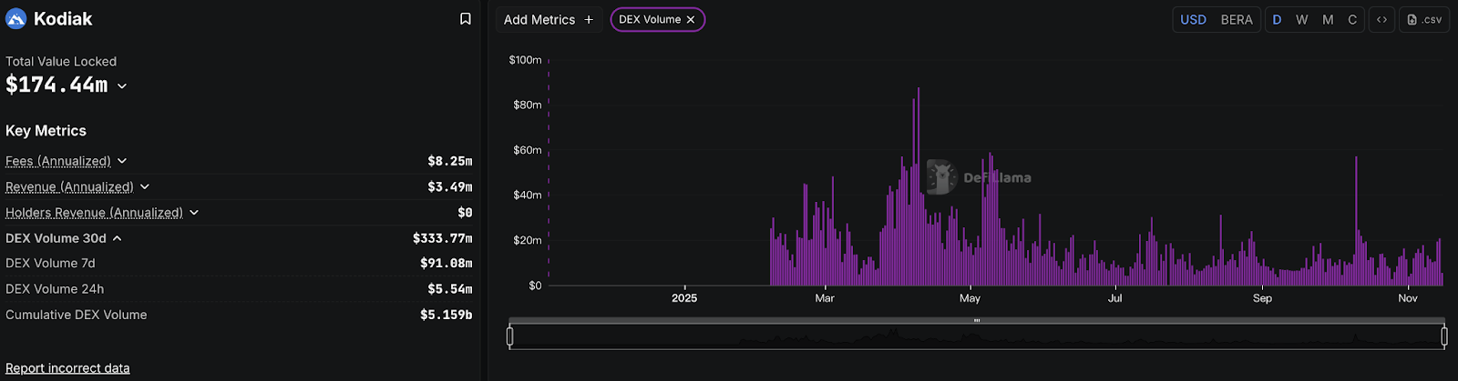 根据 DefiLlama 数据,Berachain 上的 DEX 市场已进入快速扩张阶段,而 Kodiak 几乎以绝对优势主导整个交易版图。目前,Kodiak 的日交易量约为 1,792 万美元,周交易量达到 9,348 万美元,稳居 Berachain 生态的交易量龙头。