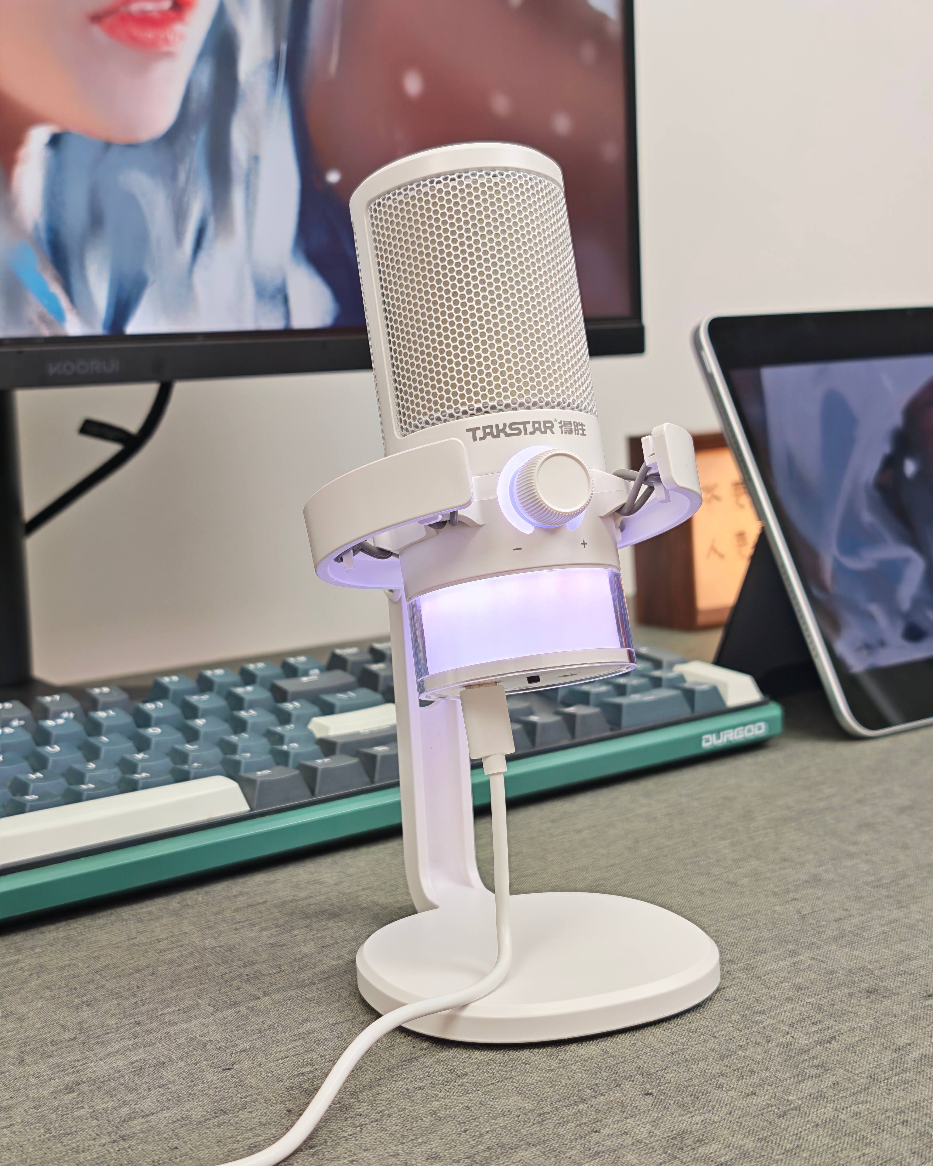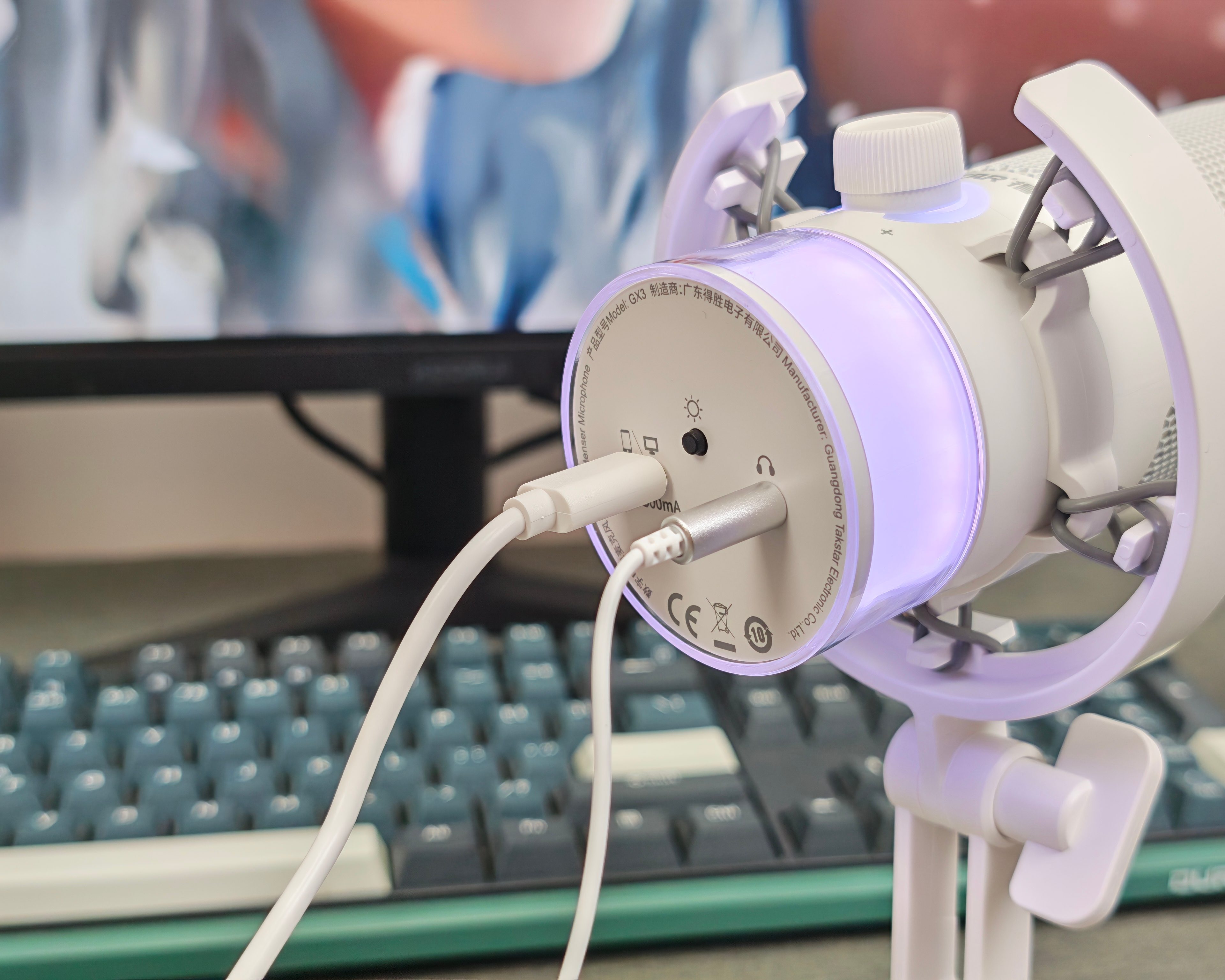这支麦克风我拿到手之后,先在桌面上放了几天。外观还是比较偏科技感的路线,不是那种很夸张的直播设备风格,但也不会无聊,摆在显示器旁边挺顺眼。它本身体积不算大,放桌面上不会特别占地方,底座稳定性也还不错。像我这种桌面本来东西就多的人,其实很怕再来一个特别笨重的设备,GX3升级款在这点上处理得比较合适。