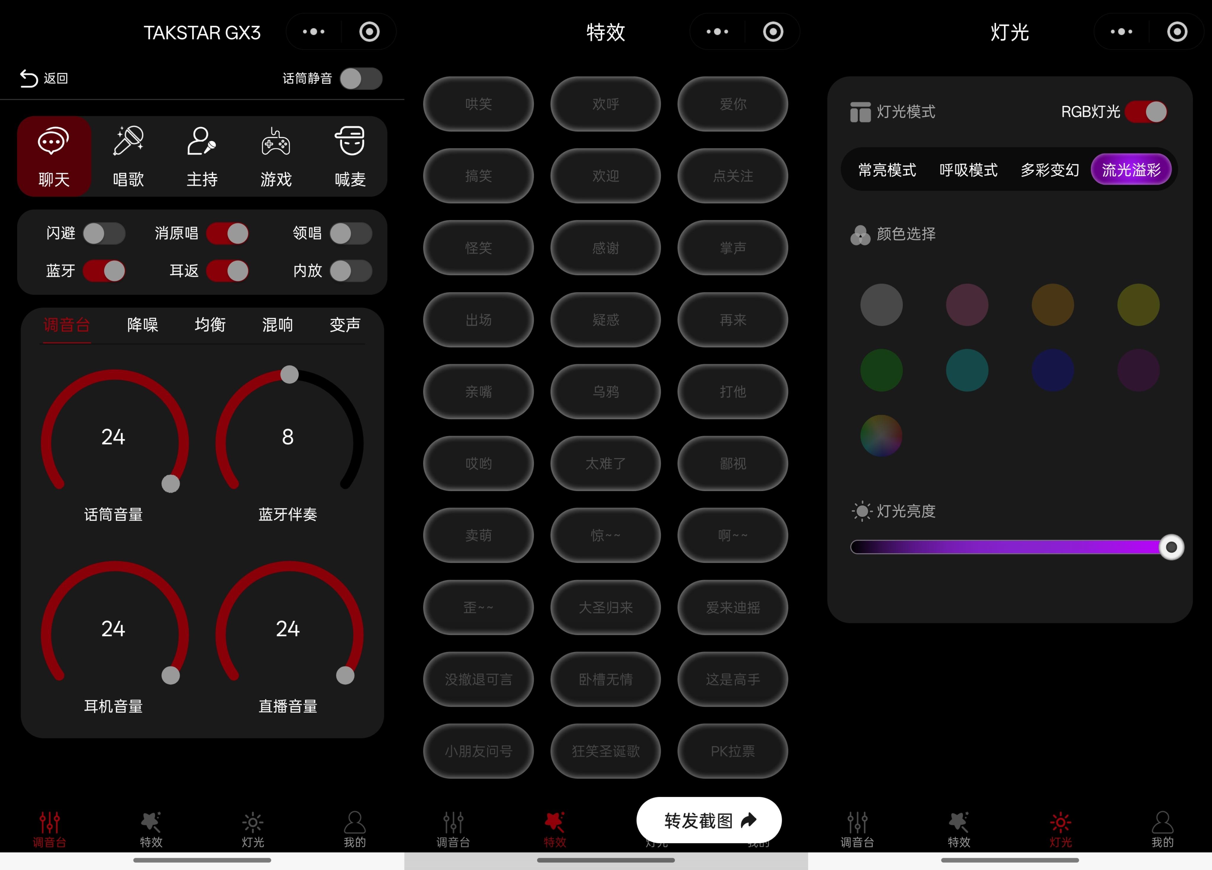 这次一个比较直观的变化,就是灯效玩法更多了。之前不少人喜欢GX3,本身就有一部分原因是它做得不难看,这次升级版又补了两种新的灯效模式(多彩变幻、流光溢彩)。你真用起来会发现,这种东西虽然不决定收音好坏,但会直接影响你对桌面氛围的感受——晚上开灯录音或者直播的时候,多彩变幻会更活跃一点;流光溢彩感觉就更柔和,安静录口播、上课、开会的时候看着舒服。