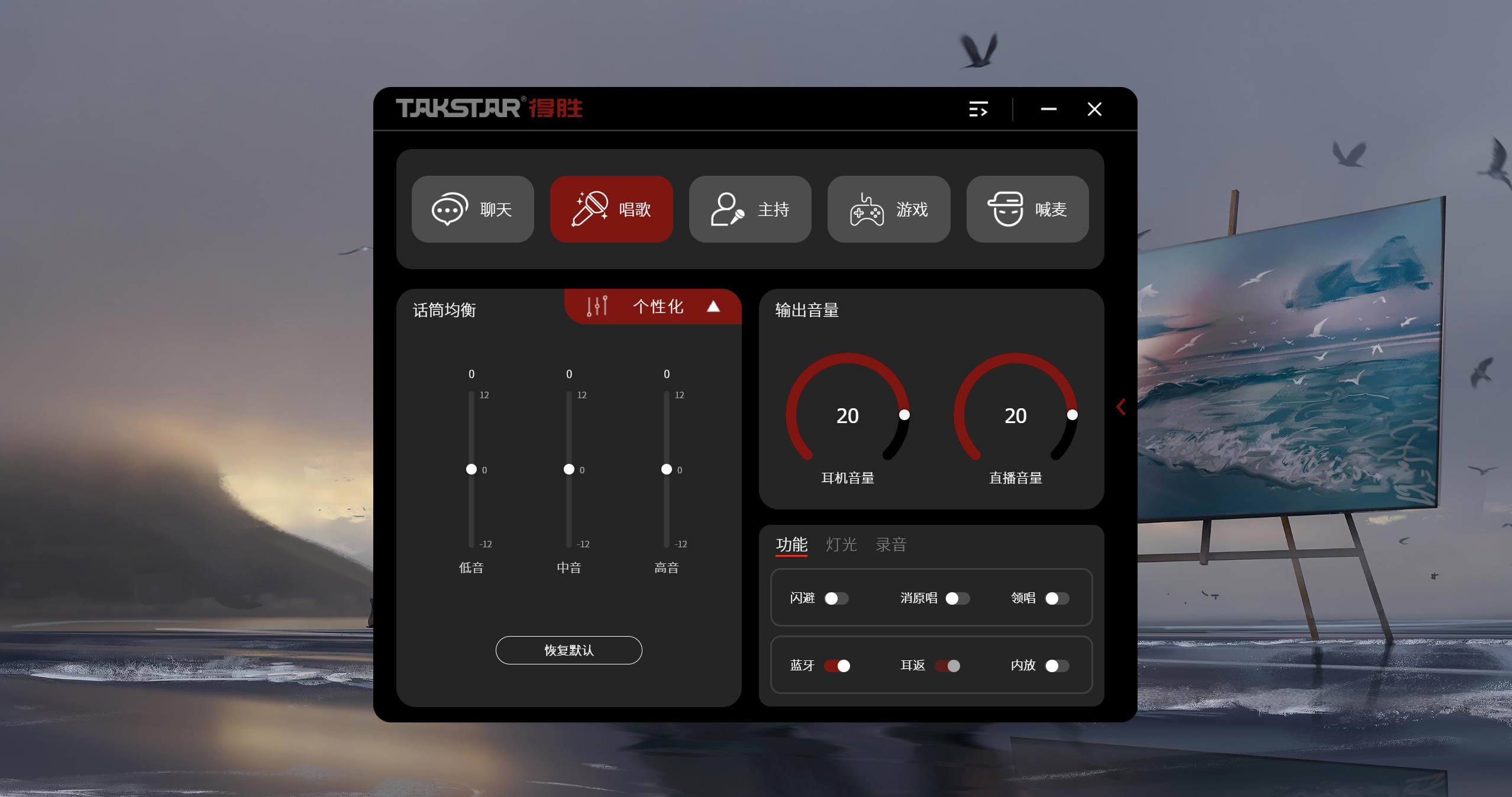 说到配套的小程序,这次我也专门试了下,整体给我的感觉就是上手没什么门槛。很多这类设备说是支持手机端调节,结果进去之后功能藏得很深,界面也乱,第一次用还得摸索半天。得胜GX3升级款这个小程序相对就直观不少,连接之后常用的功能基本都能很快找到,像灯效切换、音量调节、模式切换这些,点进去几下就能搞定。尤其是有时候不想一直守着电脑,或者直播前临时想改一下状态,用小程序直接调就很方便。