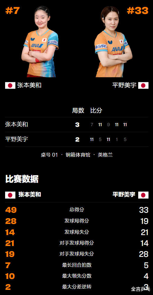 在此前的国际比赛交手中,张本美和对平野美宇也是2胜0负,而且两次都是3-1拿下没有被拖入决胜局,可见其优势还是比较大的,所以此战普遍也更看好她能获得晋级。