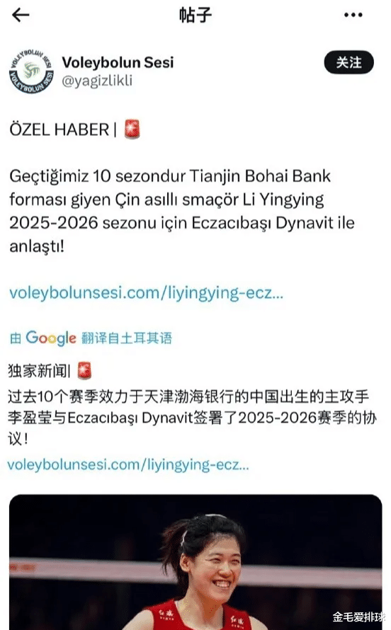 近日,有土耳其媒体爆料:中国女排名将李盈莹已经和伊萨签署了2025-2026赛季的协议!真的不知道真假!