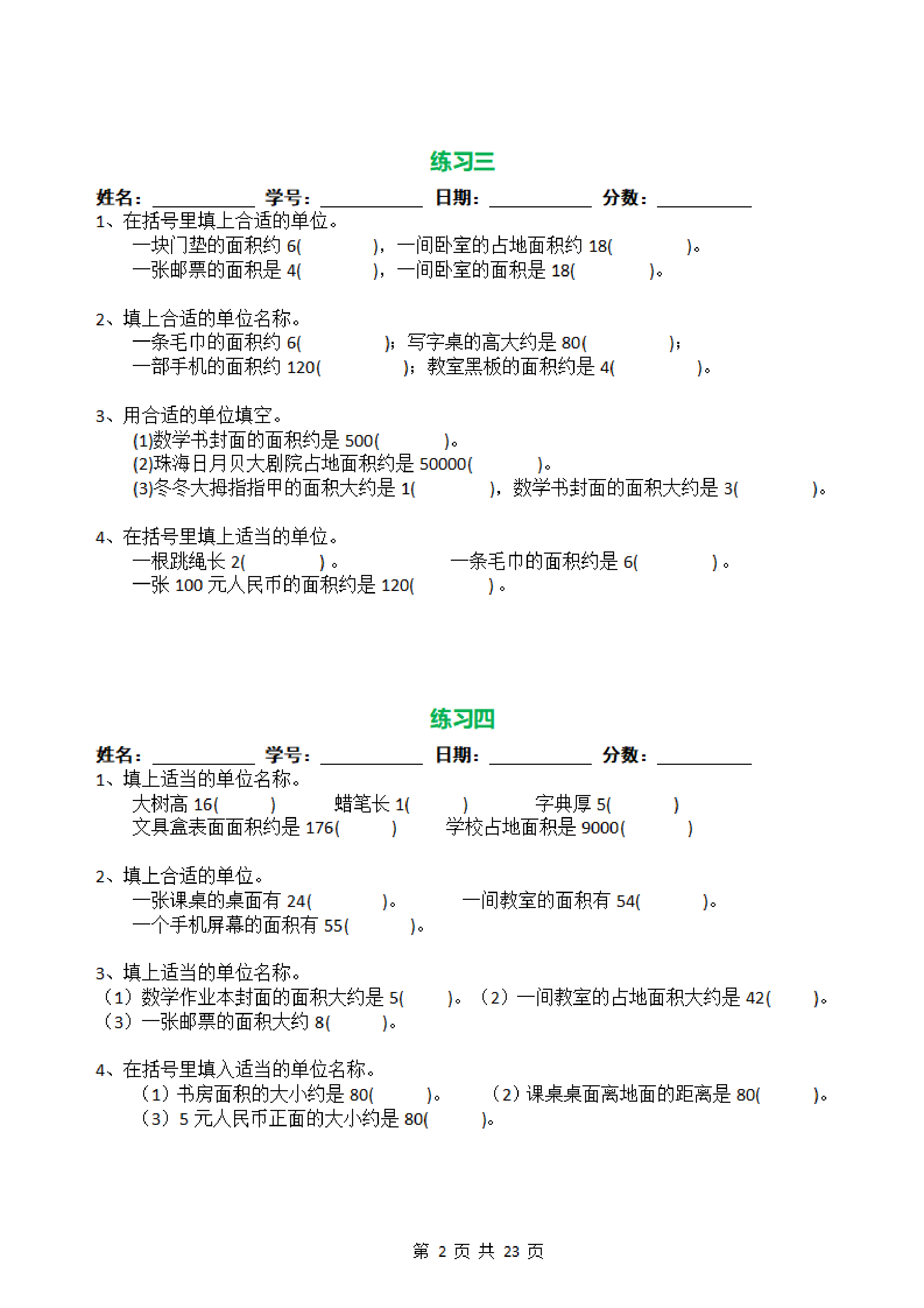一张邮票的面积是4( ),一间卧室的面积是18( )。