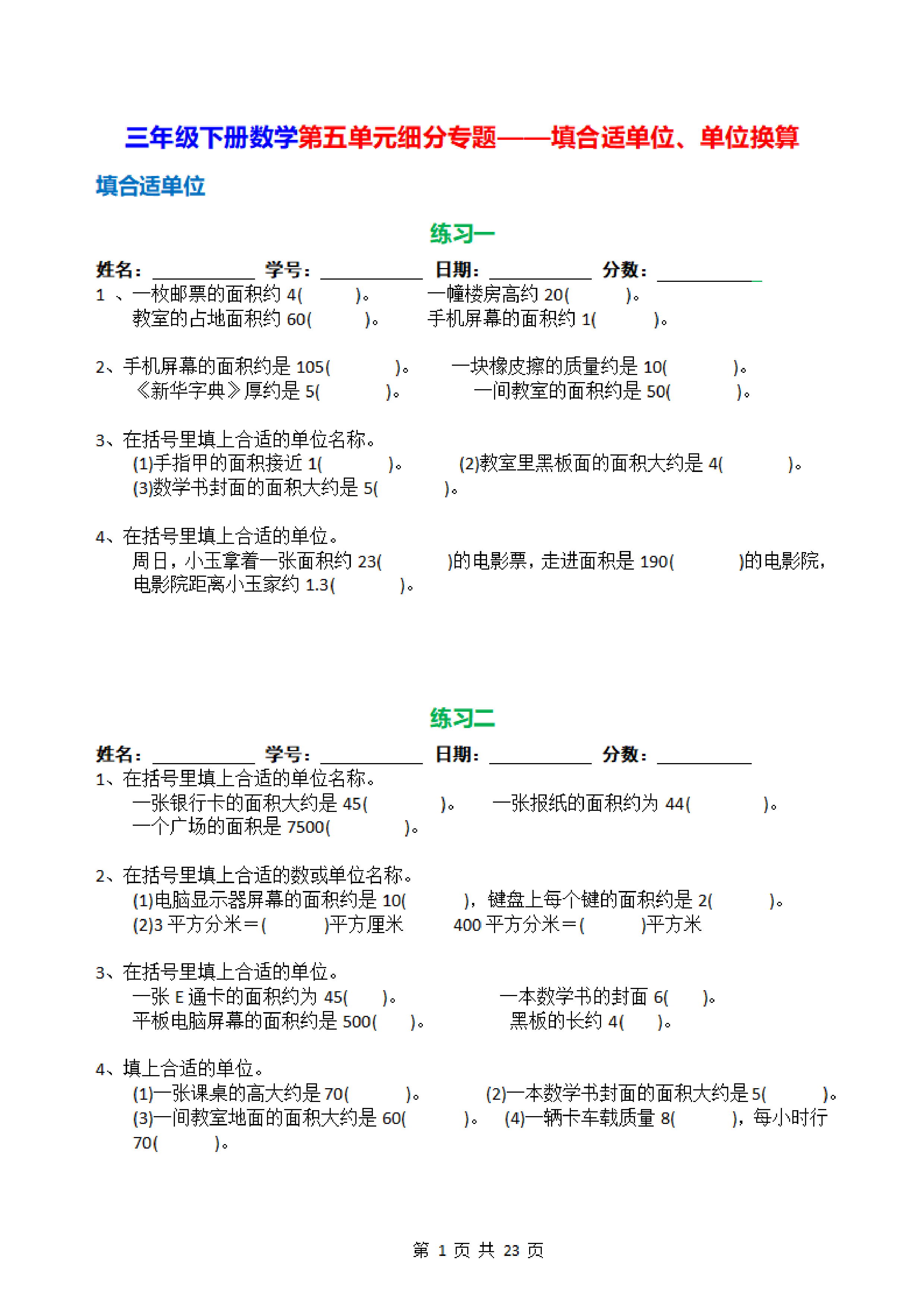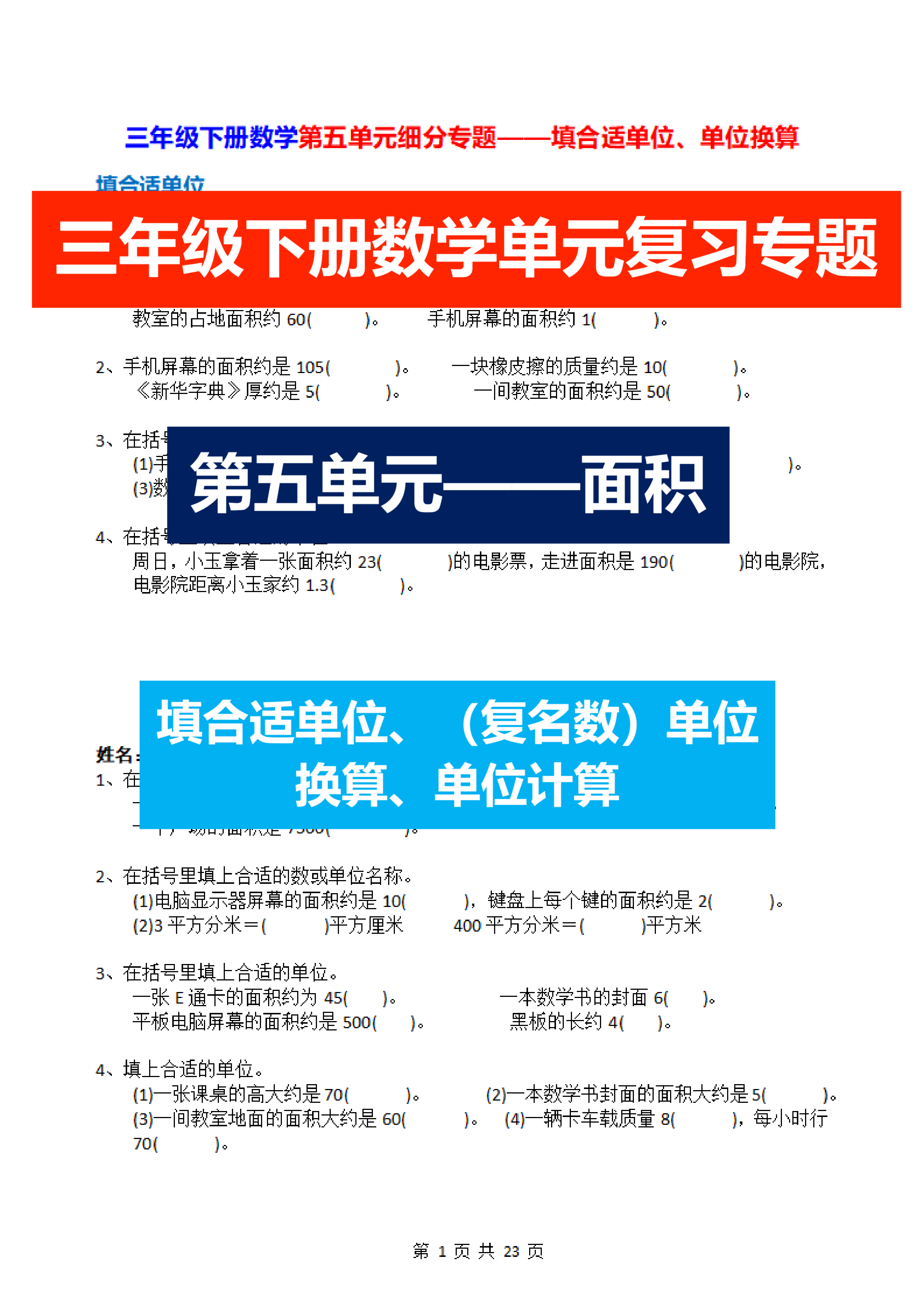 三年级下册数学第五单元细分专题——填合适单位、单位换算