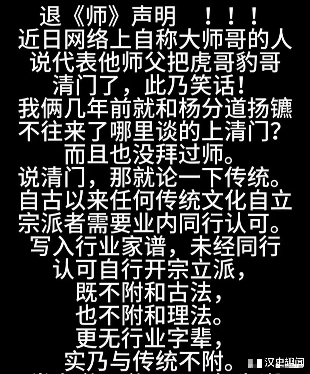 拜师宴结束后,网上就说他们兄弟两人被杨议清门了,对此他们是这样回应的。他们几年前就和杨议分道扬镳了,没有清门之说,也没拜过师。