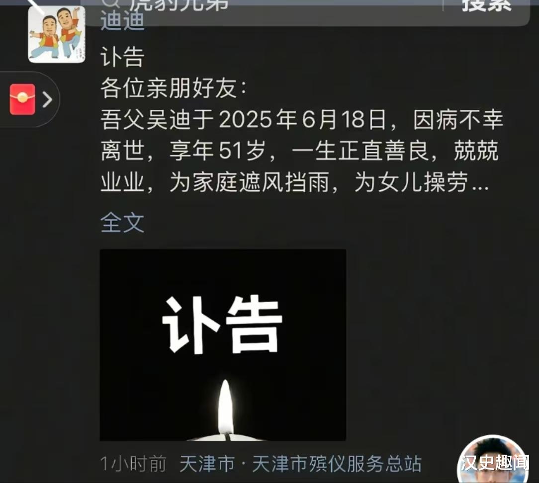 虎哥吴迪和豹哥吴越,他们是一对孪生兄弟,因为他们个头不高,大家很容易记住他们二人。吴迪去世的消息确实是真的,他们家人也发出来了讣告,说吴迪是2025年6月18日,因病不幸离世的,享年51岁。