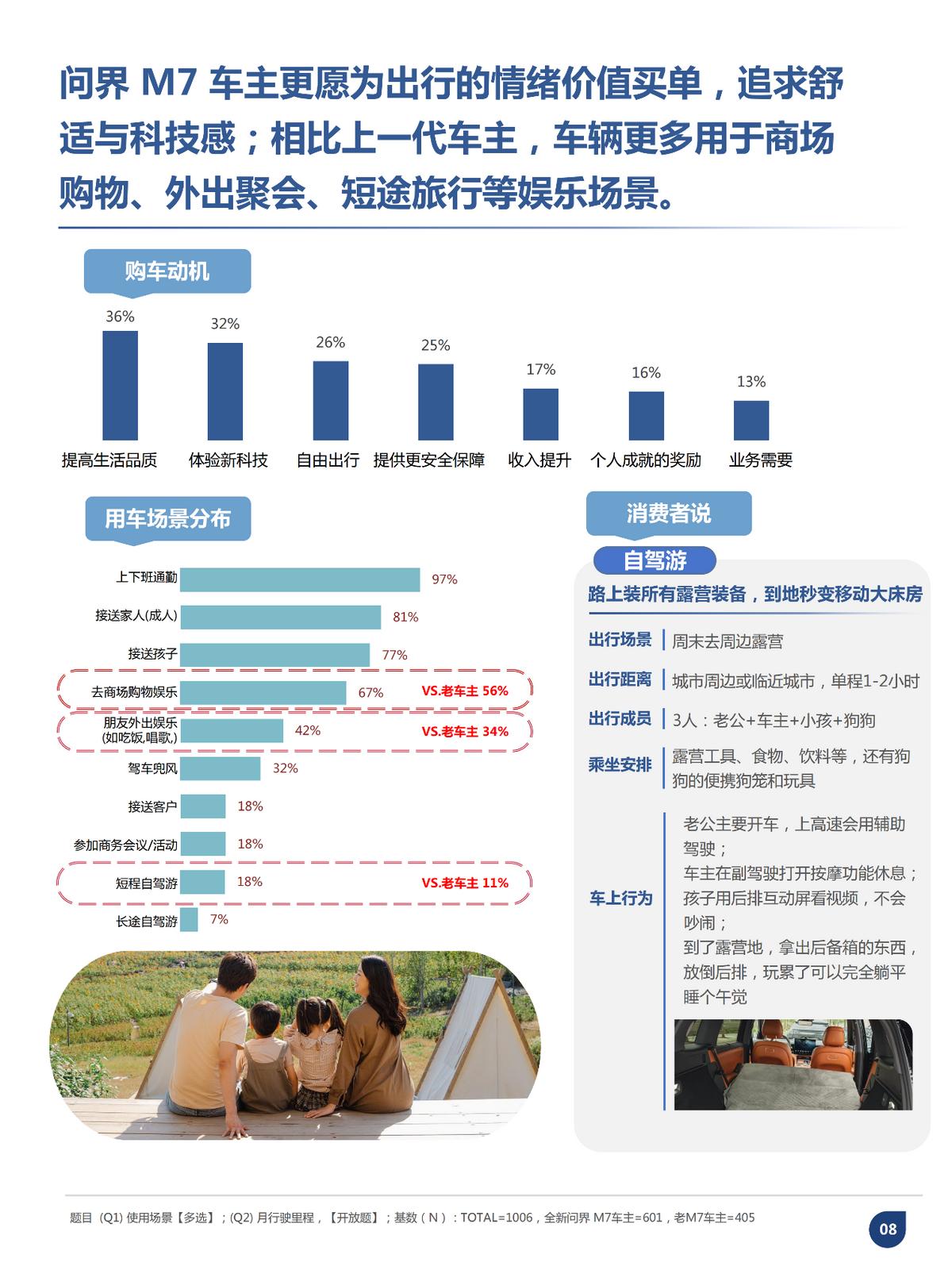 购车动机与用车场景方面,近四成用户以提升生活品质为核心购车诉求,同时高度重视亲子陪伴与多元生活体验。车辆日常使用场景全面覆盖接送家人、日常通勤、商场购物、短途旅行等。该群体更注重出行过程中的情绪价值,偏好使用零重力座椅、车内娱乐舒享类功能,将车辆视为个人生活方式的重要延伸。