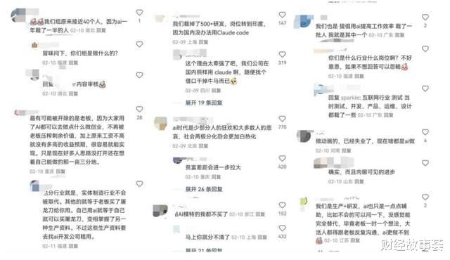 一位叫“愚公”的网友说,“我30岁,春节前被裁了,老板说,再招几个会AI的大学生就行。”还有个叫“小铁匠”的程序员感慨自己快失业了,“很可怕,我3天的活,AI不到10分钟干完。”。
