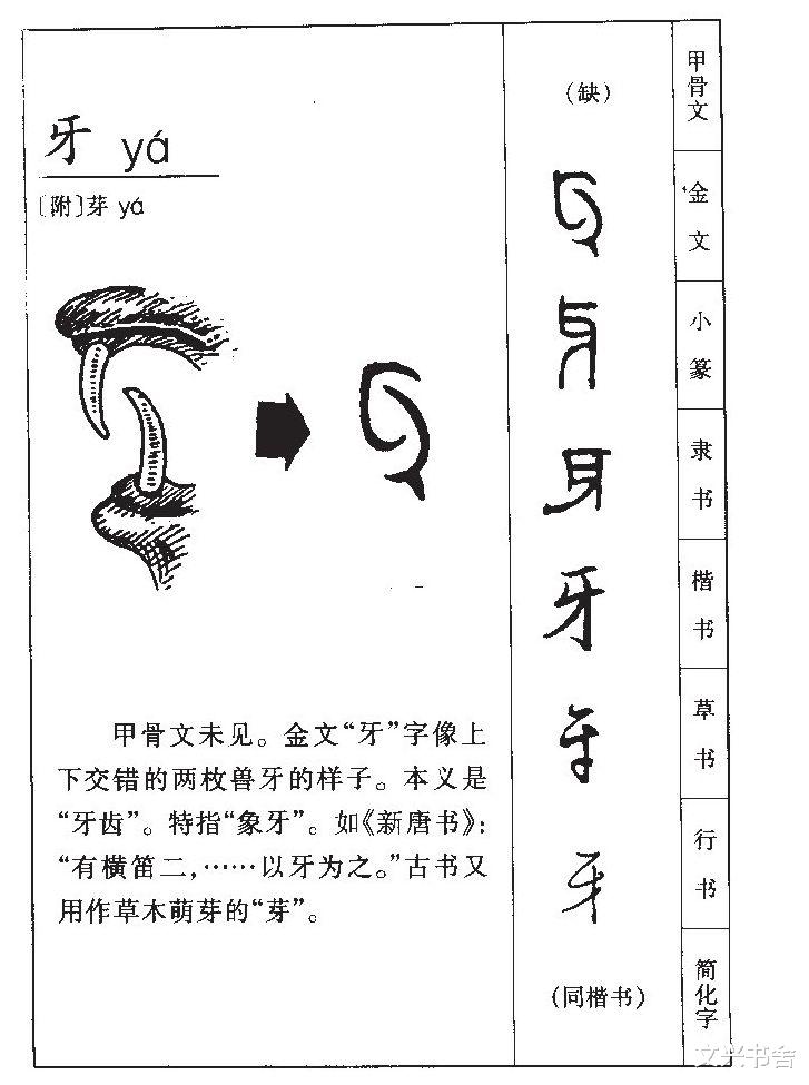 “牙”的本义为臼齿,位于口腔后部(“当车”,即靠近牙床部位),《说文解字》释为“牡齿也,象上下相错之形”,“牡齿”经段玉裁校正为“壮齿”,即粗大的牙齿,强调其交错研磨的功能。段玉裁进一步注解:“前当唇者称齿,后在辅车者称牙。牙较大于齿”,清晰点明二者的位置与形态差异。臼齿深藏于口腔,主要负责磨碎食物,韩愈《与崔群书》中“左车第二牙,无故动摇脱去”,“左车”指左侧牙床,“第二牙”即明确指向臼齿,沿用的正是本义。