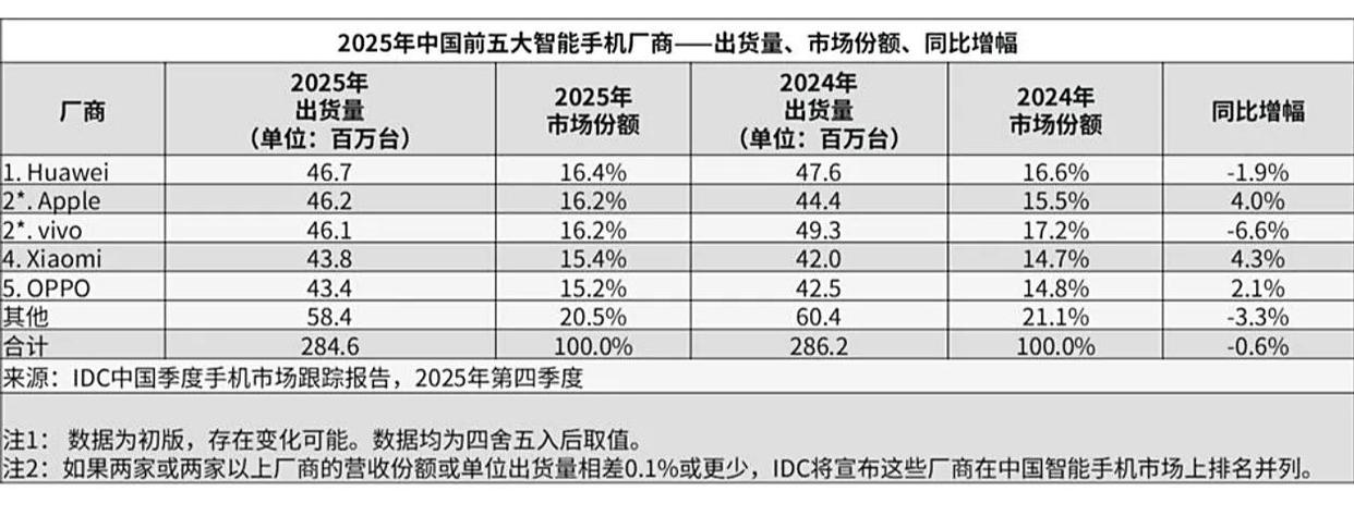 从市场格局来看,这场登顶颇具含金量。2025年华为出货量虽较2024年微降1.9%,但仍压过了苹果(4620万台,同比涨4%)和vivo(4610万台,同比跌6.6%)。苹果靠着新品的热度差点翻盘,vivo却因产品迭代节奏失速让出了去年的榜首;小米、OPPO虽分别实现4.3%和2.1%的增长,但在高端市场的技术突破仍显乏力,始终难以冲击第一梯队。在国内手机整体出货量微降0.6%的存量市场里,华为能突出重围,2025年推出的一系列新技术成了关键推手。